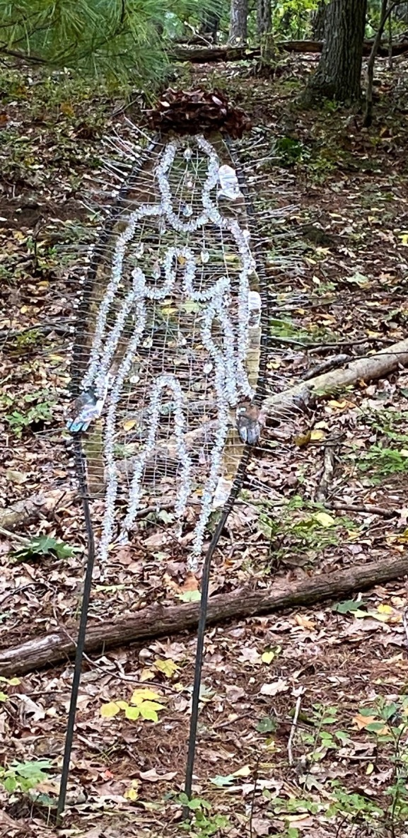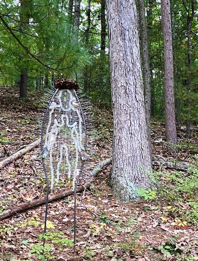 Carolyn Enz Hack Orchard Guardian (2021) Steel, stainless steel cable, lead crystal, mica, copper:“The telltale signs of human presence can be seen and felt, even in wilderness. Humans no longer need to be in proximity to impact even the most remote places. This figure is symbolic of human presence over time.” ( quote from Carolyn Enz Hack Artist Statement for Orchard Guardian) For photos of Orchard Guardian with better color and details: https://carolynenzhack.com/portfolio/orchard-guardian/