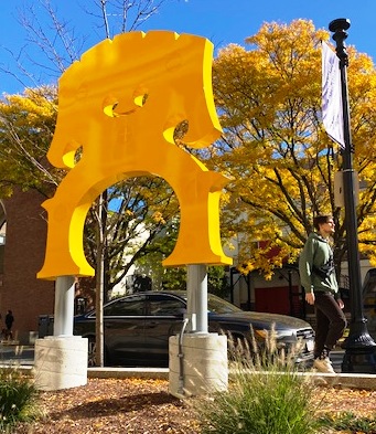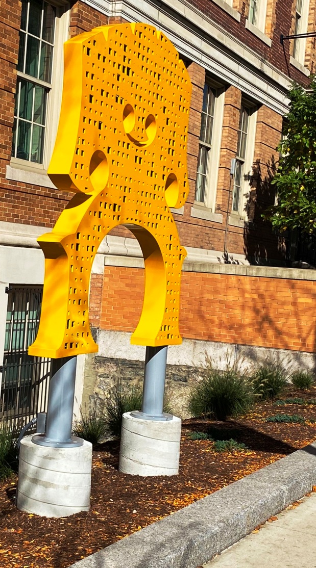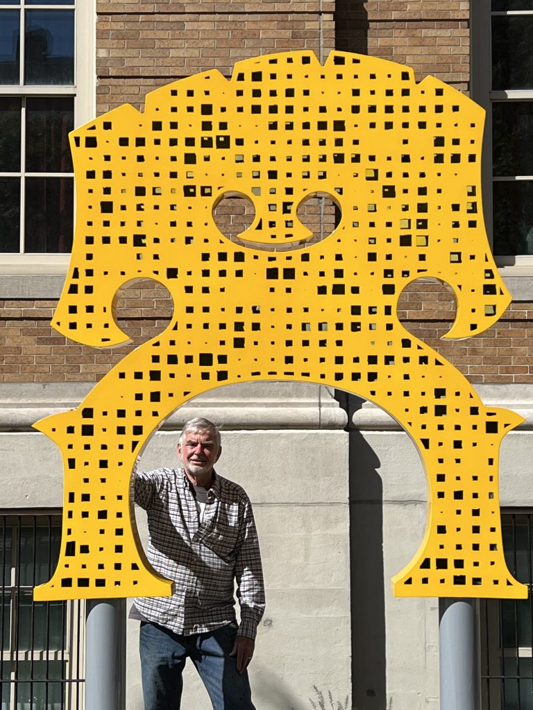 “Eight feet tall, painted a deep yellow and created from metal arranged in a woven pattern that creates square space between the weft and the warp, “Bridge” will be lit from within when it is placed on St. Botolph Street, where it will be a complementary piece to “Scrolls,” another metal sculpture based on the neck of a violin and lit from within.”