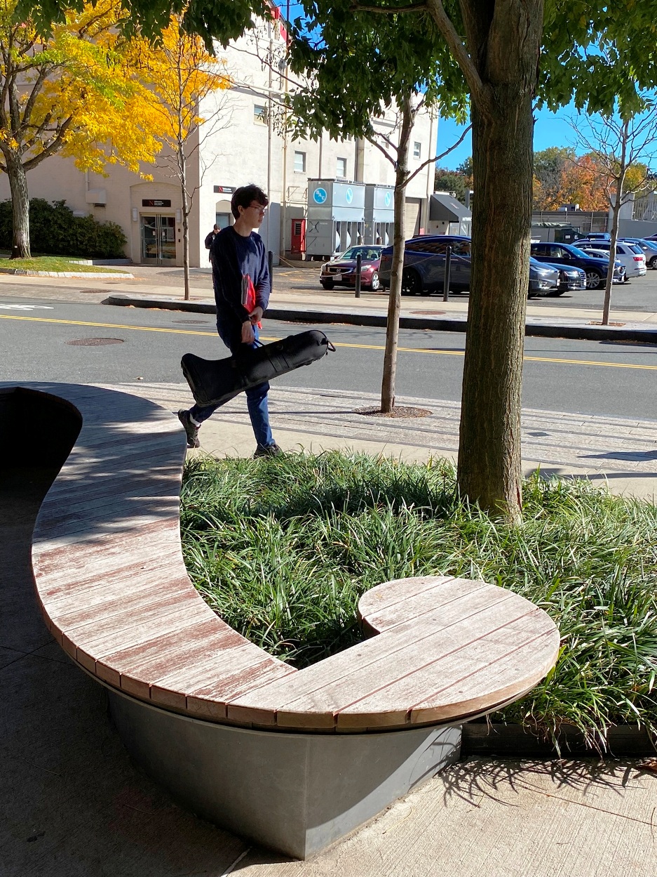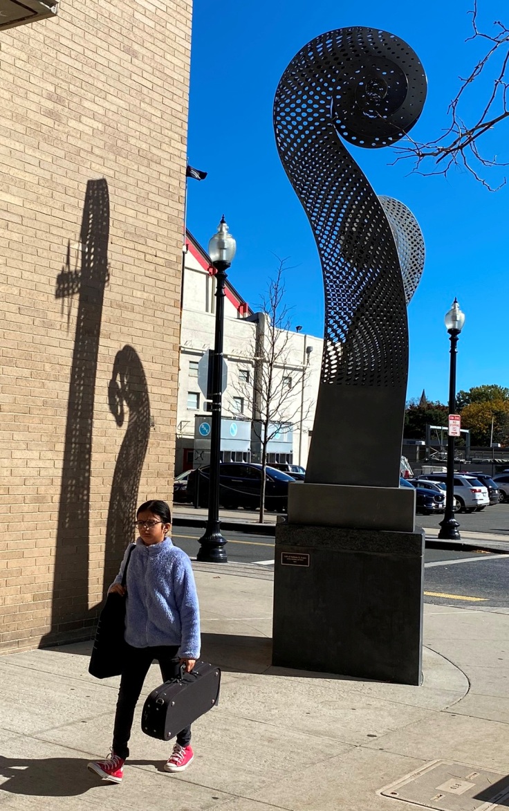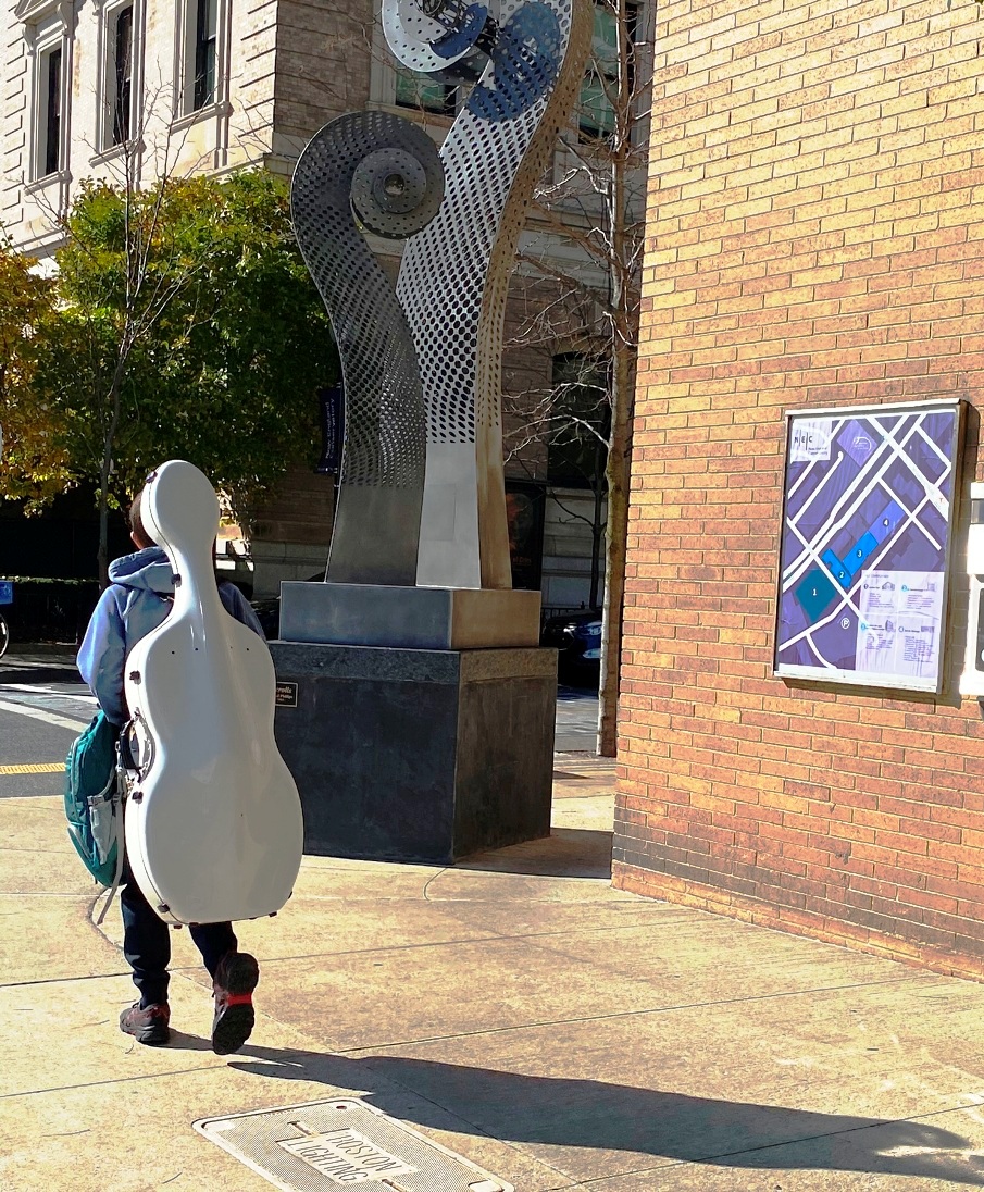 My Saturday afternoon visit to David Phillip’s sculptures along St. Botolph Street was a perfect time to see many young students with string instruments heading to or from lessons and rehearsals. The transported instruments heightened my awareness that each sculpture referenced parts of cellos and violins. This post includes a few photos from that October day plus quotes and links with background and pertinent information about the artist’s work. Quotes among the photos all come from one source, which gives perspective on the funding by Tony Lopes for David Phillips’ art: “Sandwich Artist Creates Sculptures For New England Conservatory” by JOANNE BRIANA-GARTNER in Cape News, Sept 2022