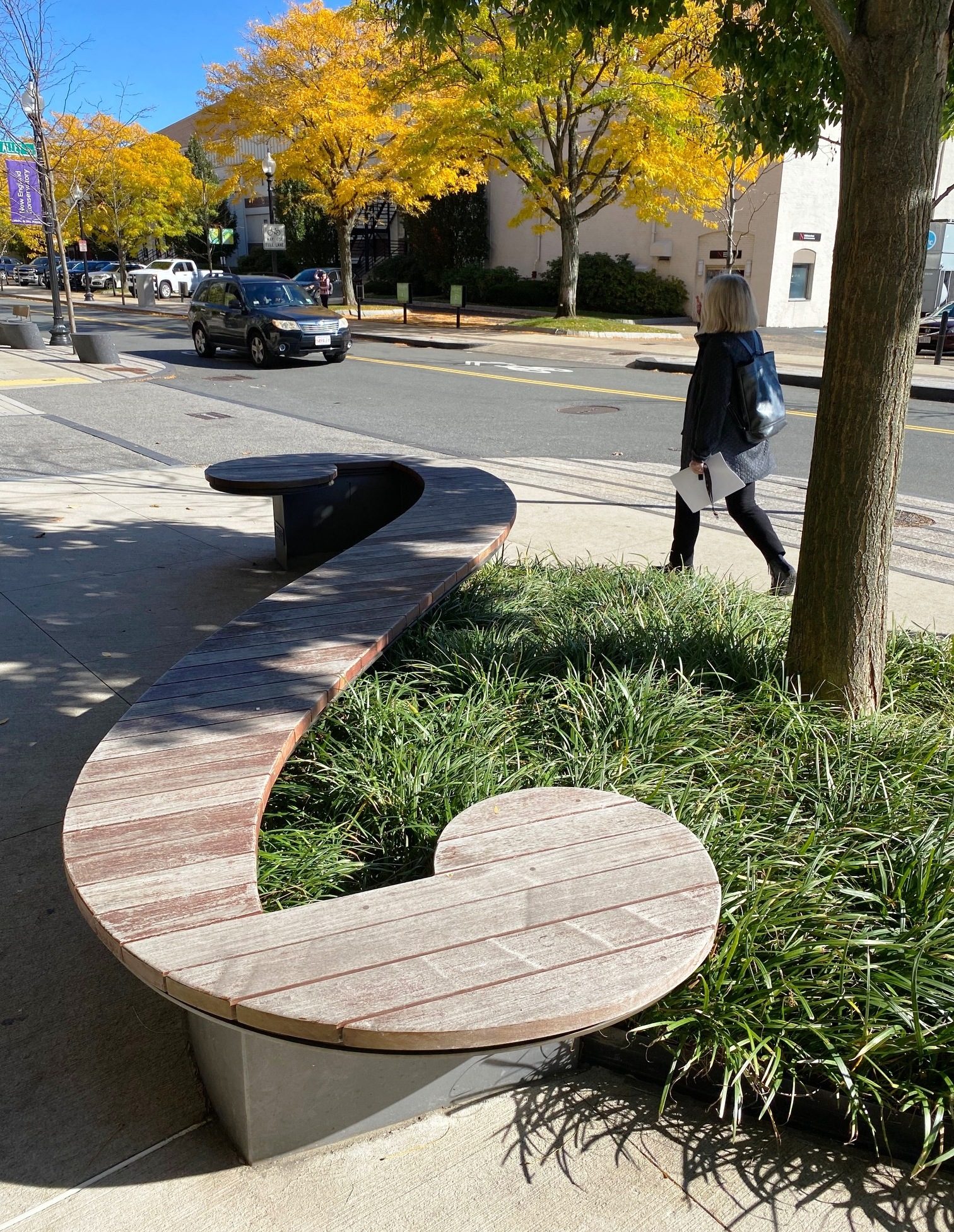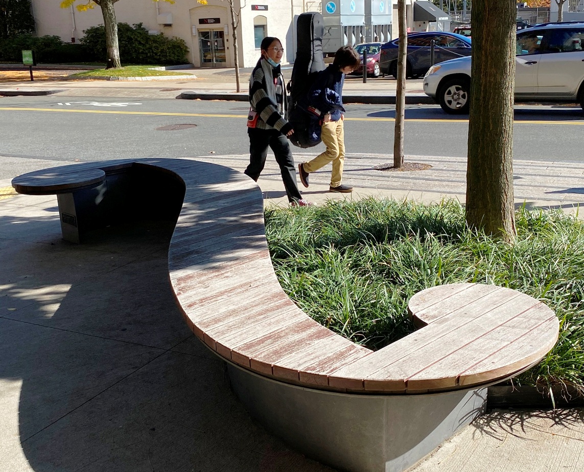 David Phillips’ “Bridge” 2022 ( left) recently joined “Tony’s Bench” 2017 (center) and “Scrolls” 2017 (right) along St. Botolph Street on New England Conservatory campus. These are three of several sculptures funded by Tony Lopes (1940-2013) or his estate.
