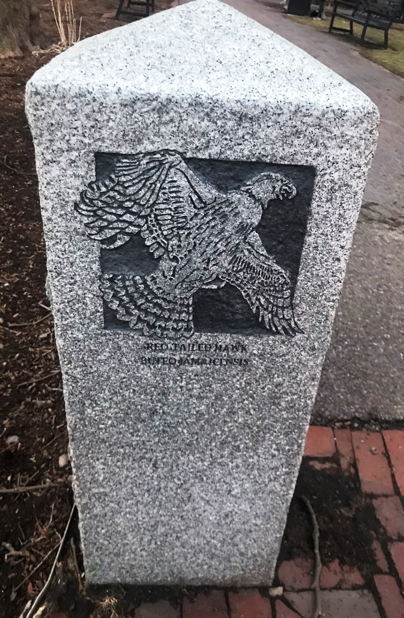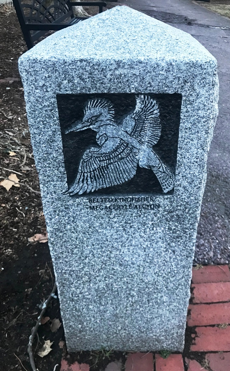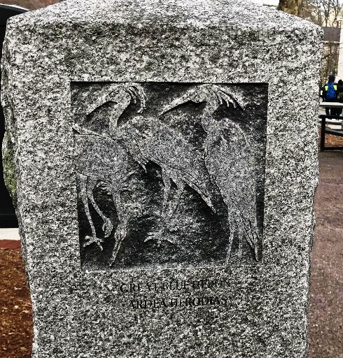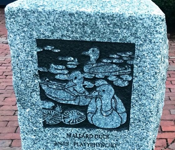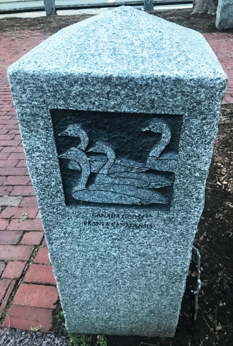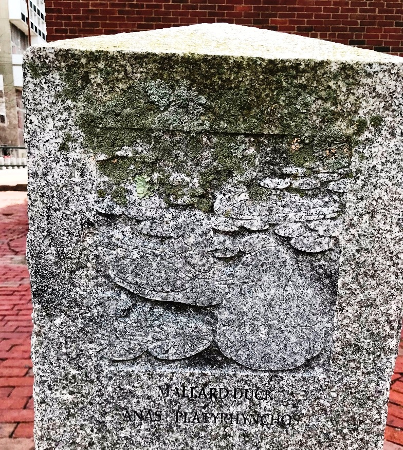 “William Reimann’s granite carvings at Corporal Burns Park on Flagg Street. The Cambridge sculptor’s 1998 carvings in posts and sidewalk tiles in the park depict birds and fish of Charles River—red-wing blackbirds, black-capped chickadee, mallard ducks.” (quote from Self-Guided Tour Of Public Art In Central Square, Cambridgeport, Riverside )