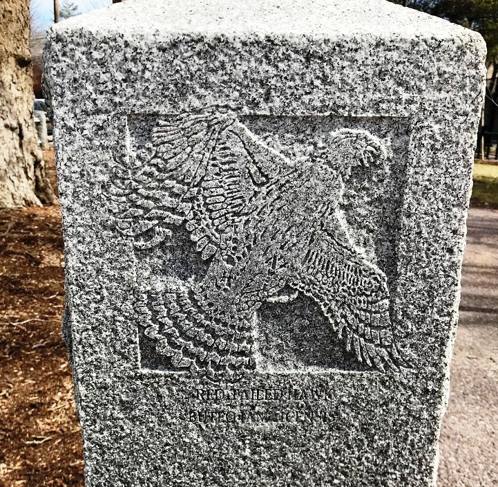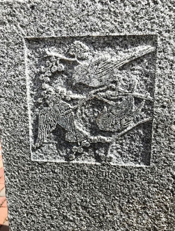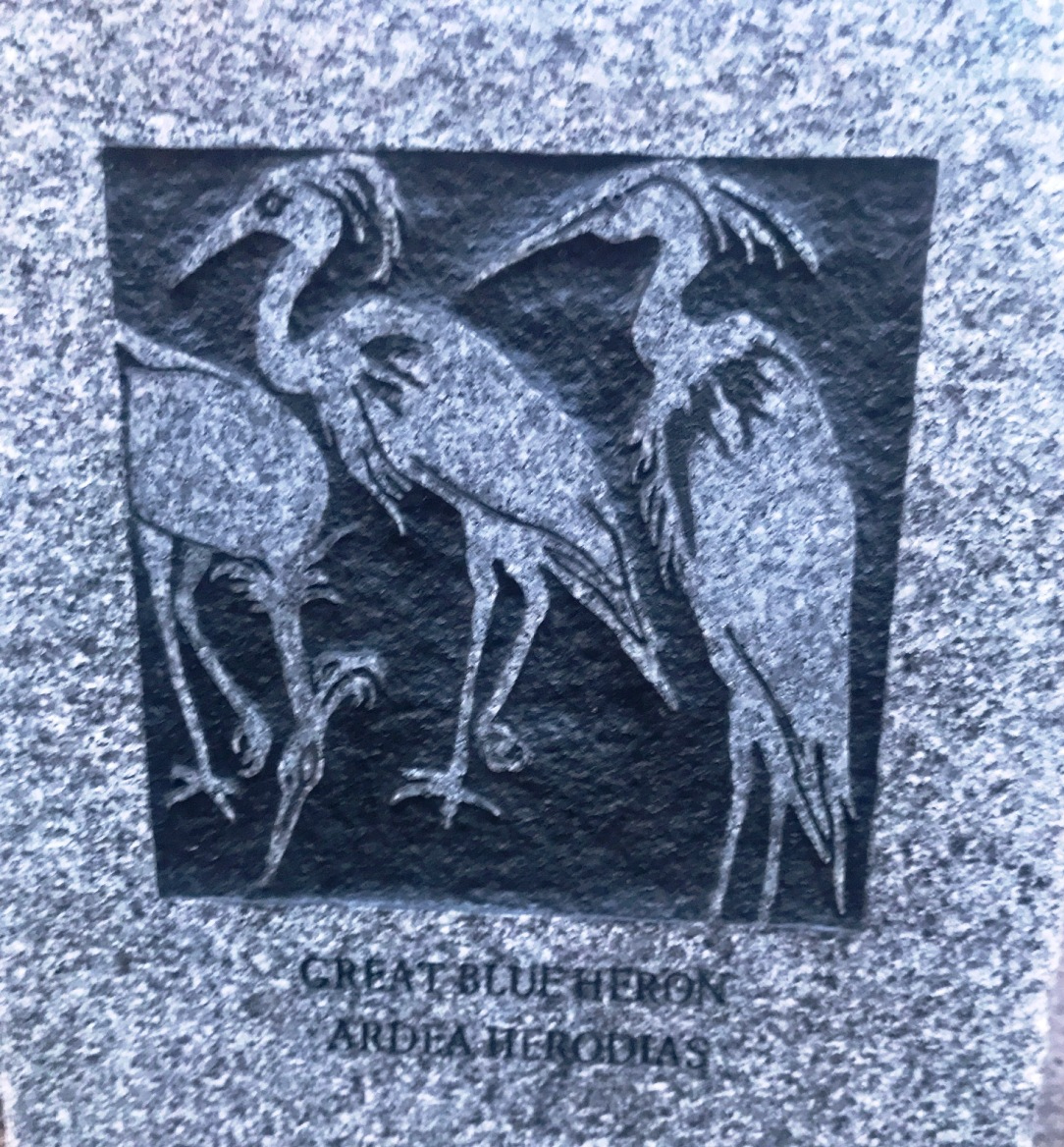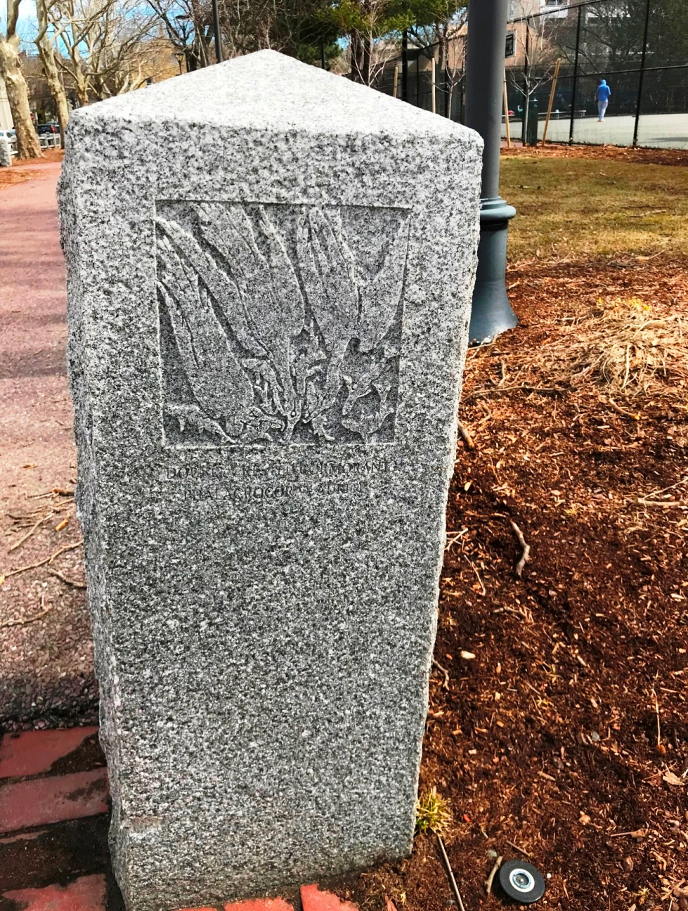 “William Reimann’s granite carvings at Corporal Burns Park on Flagg Street. The Cambridge sculptor’s 1998 carvings in posts and sidewalk tiles in the park depict birds and fish of Charles River—red-wing blackbirds, black-capped chickadee, mallard ducks.” (quote from Self-Guided Tour Of Public Art In Central Square, Cambridgeport, Riverside )