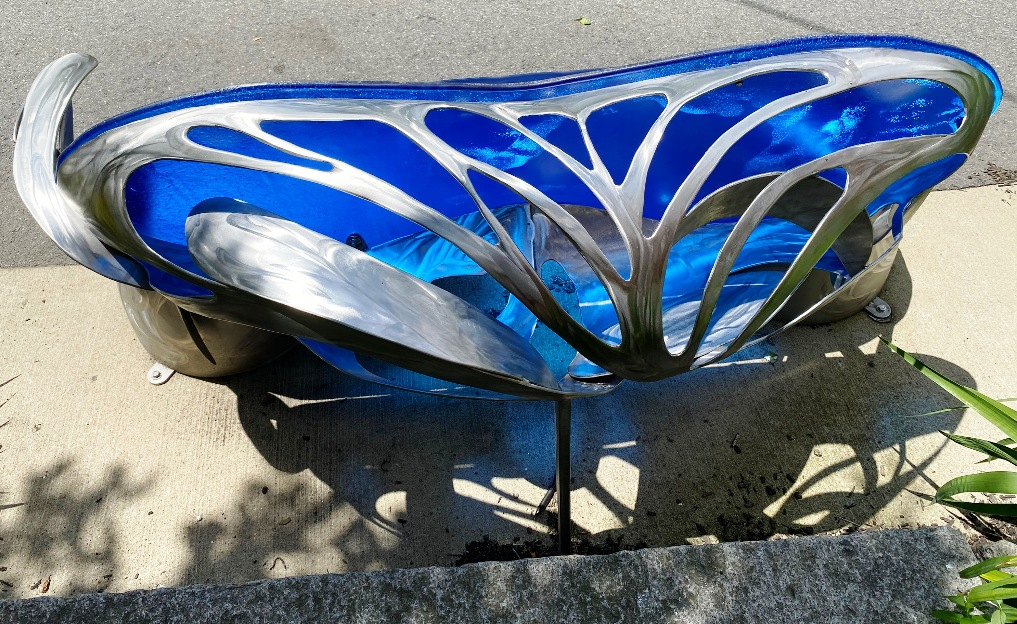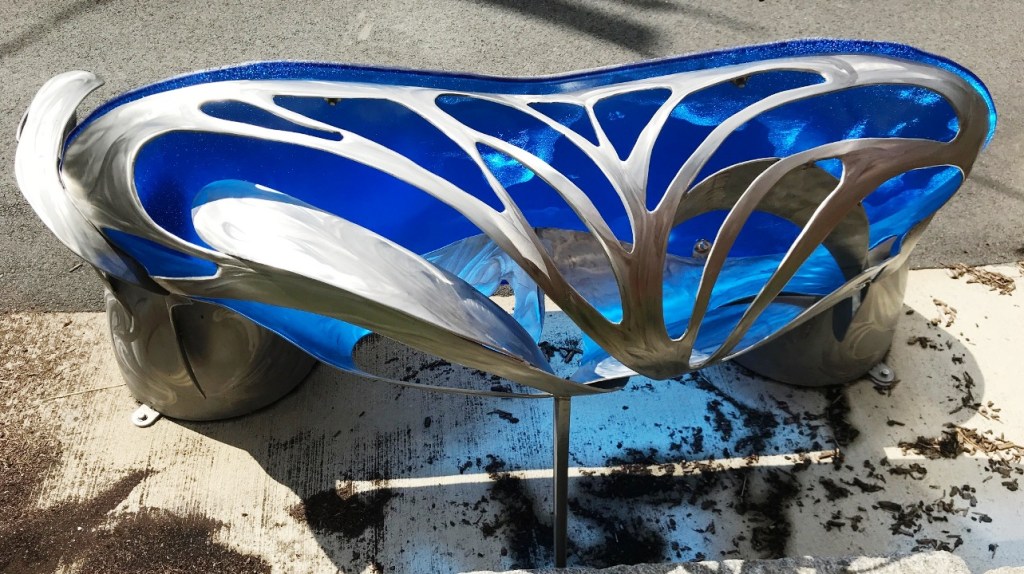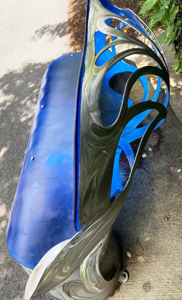 “Hoke’s two benches are distinguished by their materials: stainless steel pipe and translucent blue polycarbonate. The artist transformed curving sections of pipe into the legs and rounded backs of the benches. Then he ground swirling lines into the legs and cut droplet shapes from the metal seat backs to evoke flowing or splashing water. The resulting designs let light through so that the blue plastic of the seat front glows.” (quote from New Art Benches And Sculpture At Sacramento Field Evoke Pond That Historically Occupied The Park )