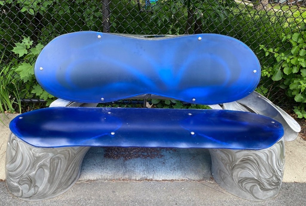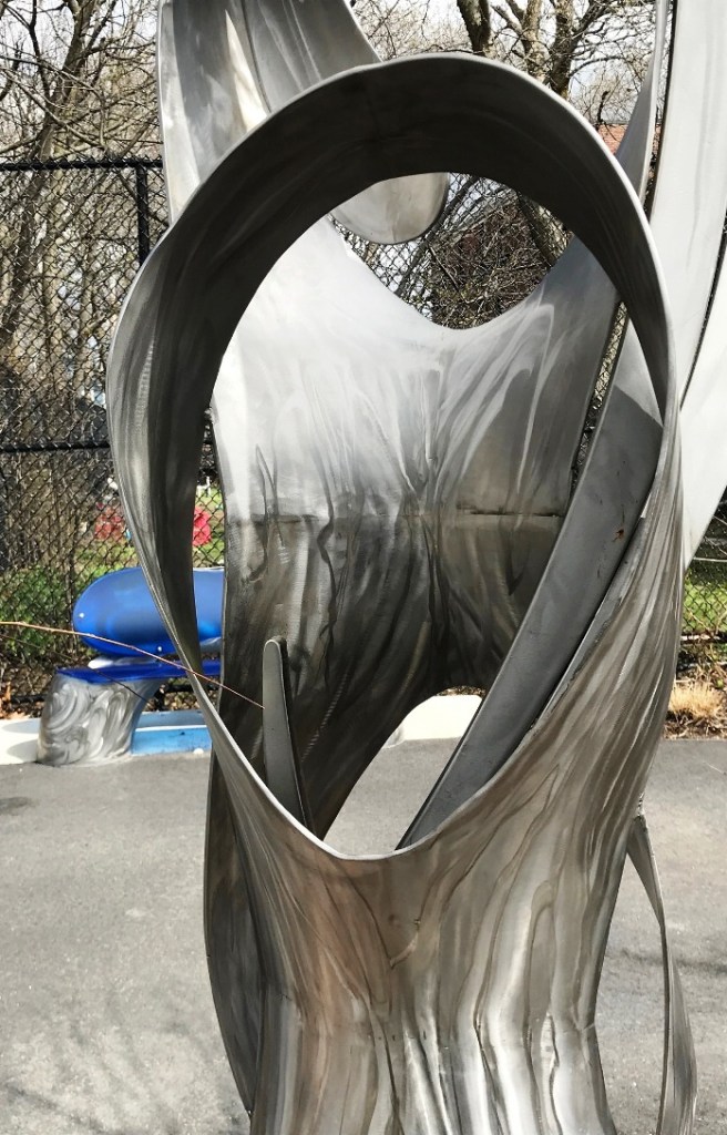 “The benches are accompanied by a vertical stainless steel sculpture of curving shapes, reaching skyward, that were pieced together from the pipes cut up to make the benches. Hoke’s references to pipes and water speak to the history of Sacramento Field. The Somerville Dyeing & Bleaching Company bought the property in 1853 and adapted it to feed as much as 100,000 gallons of water into the plant each day.” ( quote from New Art Benches And Sculpture At Sacramento Field Evoke Pond That Historically Occupied The Park )