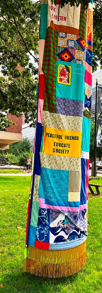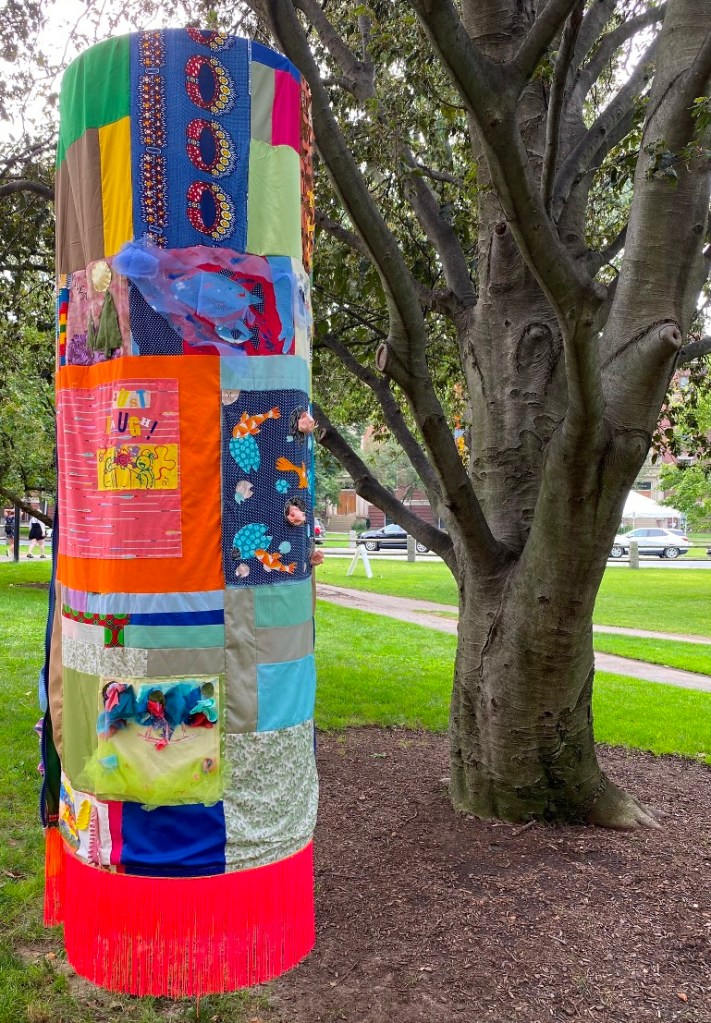 “Participants created unique fabric collages, blue sun prints, and vinyl word art projects. Once quilted, these individual textile patches, rich with visual vocabularies and personal narratives, act as snapshots of the participants’ lived experience. Ran fabricated the sculptures in the form of traditional Chinese chuangs—cylindrical textiles covered in written prayers to keep Buddhist teachings active when no one is present to recite them. “ (quote from HMSC Where We Belong: Tree Chuangs)