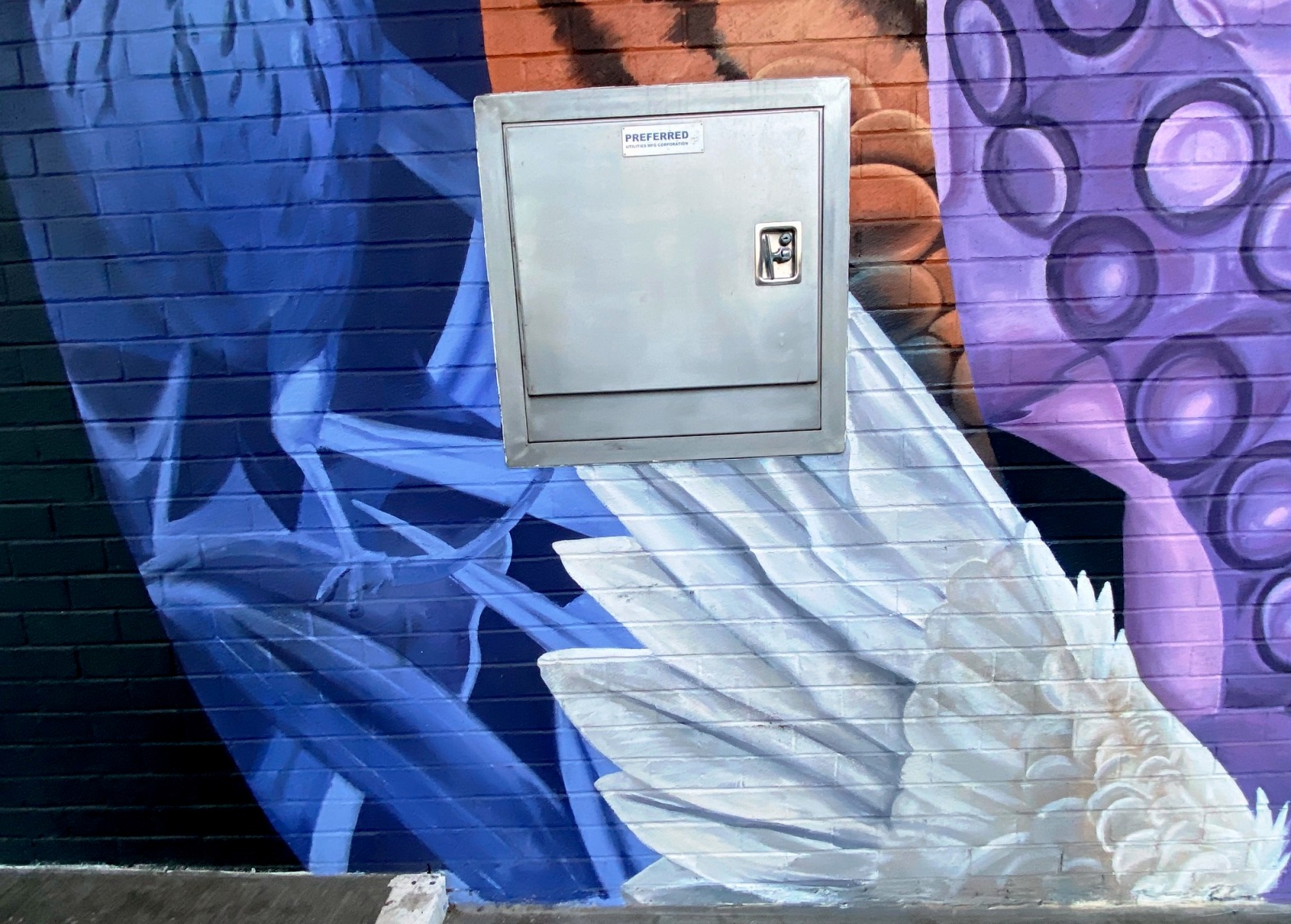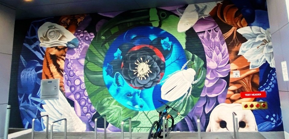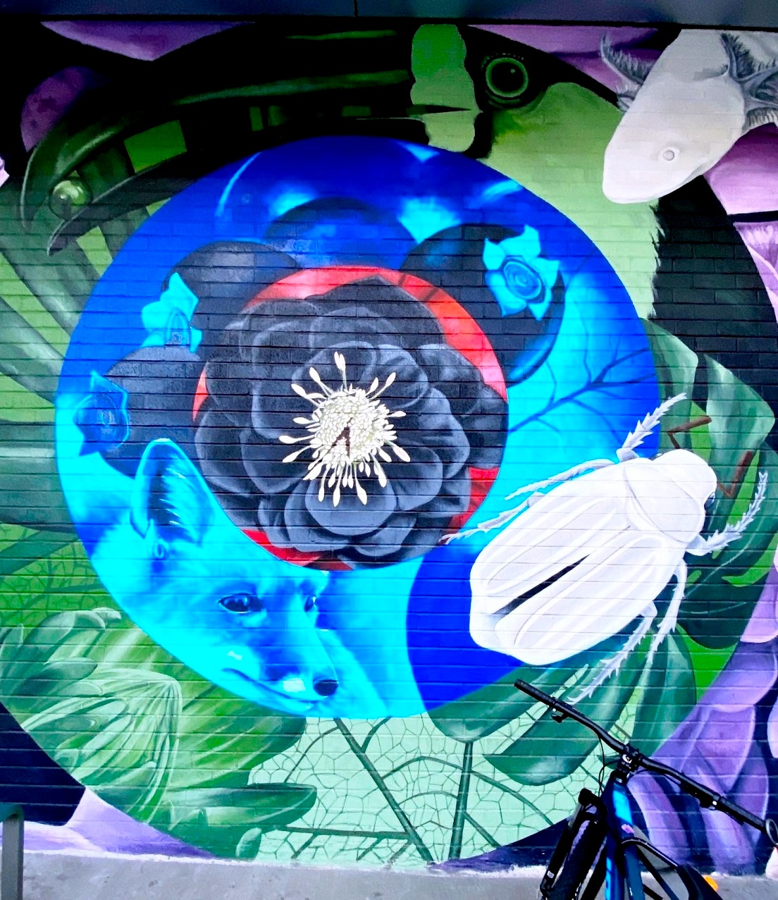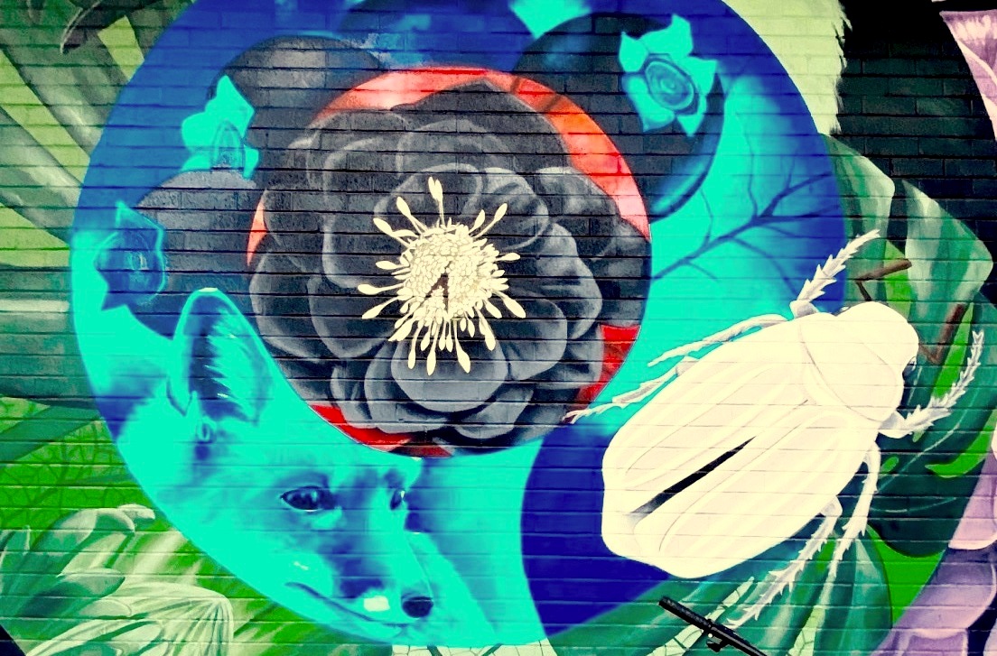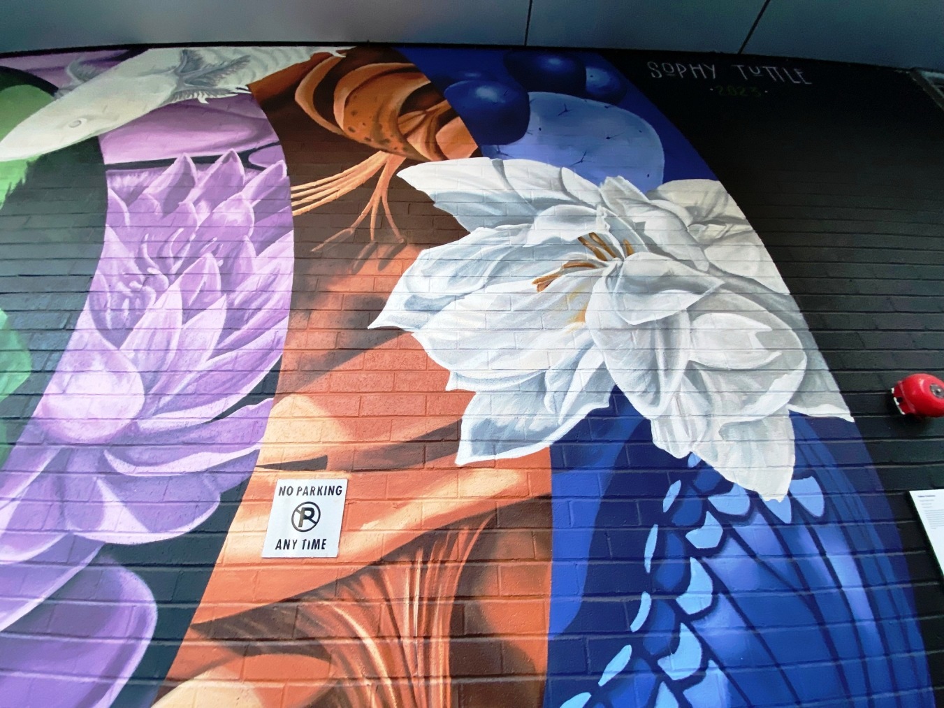 “Sophy began painting murals after a residency in Oaxaca, Mexico in 2013, where she learned from local activists and artists …Often vibrant and dynamic, these murals are a way to begin conversations within the community about our relationship with nature and the ways in which we both conflict and collaborate with our fellow creatures every day. “ ( quote from Sophy Tuttle, Boston-based artist specializing in nature-inspired murals and artwork. )