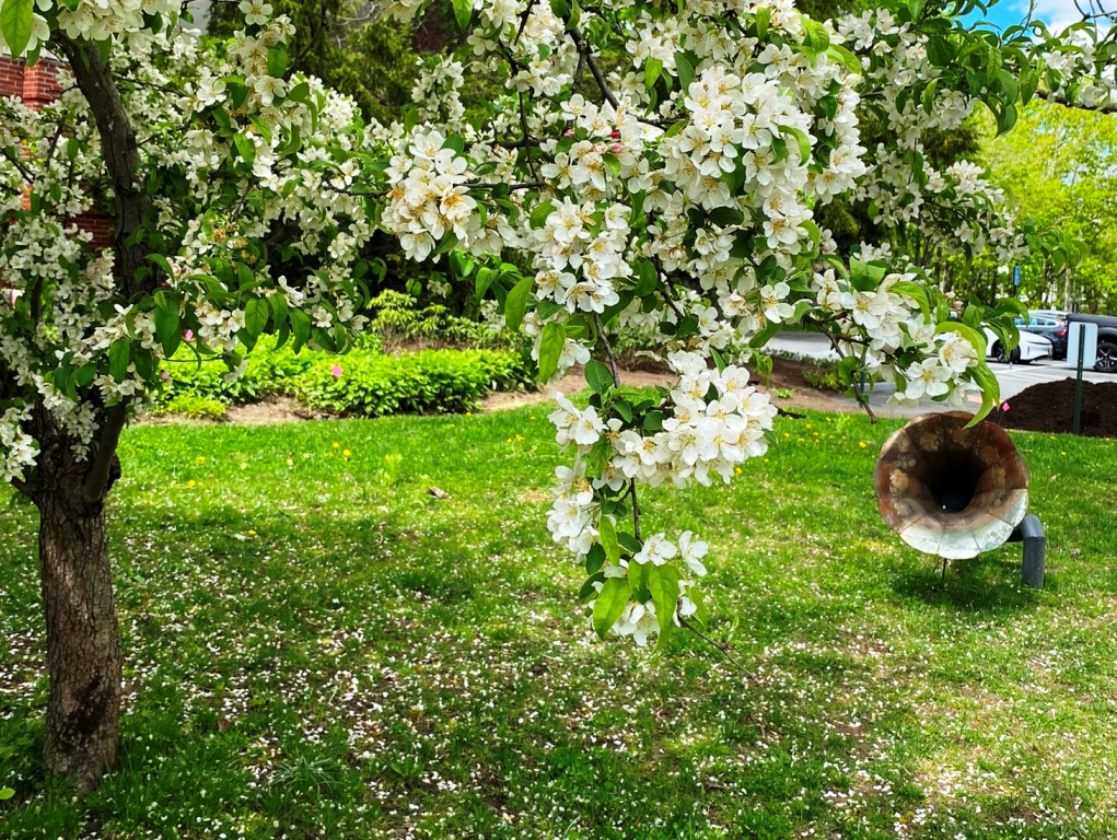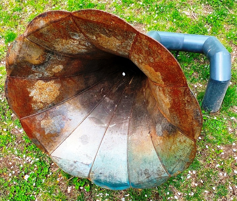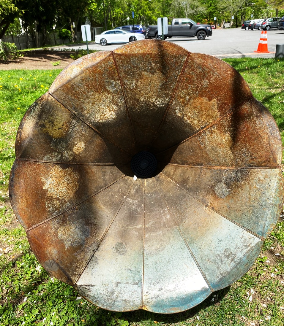 “(Victrola Speaker, steel and paint )Listen to the sound of the mycelium*, actively distributing water and/or chemical substances to the surrounding plant community, breaking down matter to create the physical earth we exist. Hidden under our feet is probably one of our greatest solutions to so many of our environmental problems. ( quote from Tapped In Statements) *mycelium is the vegetative part of any fungus, consisting of a mass of branching, threadlike hyphae, often underground