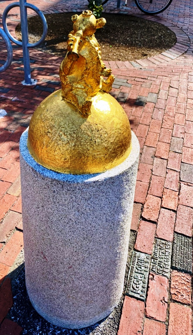“The show pulls back the curtain through a display of tools, photos, videos and lots of stories. There’s also a cute tent in the middle of the gallery. It holds a gold replica of one of the city’s most cherished sculptures.”…. “People love to touch the piece, so Uram’s team has to restore its gold leaf every couple of years. “We set up the tent because gold leaf is very light and it blows with the wind,” Uram explained.”( quote from How Cambridge’s public art protectors fight graffiti and grime, Andrea Shea, July 1, WBUR)