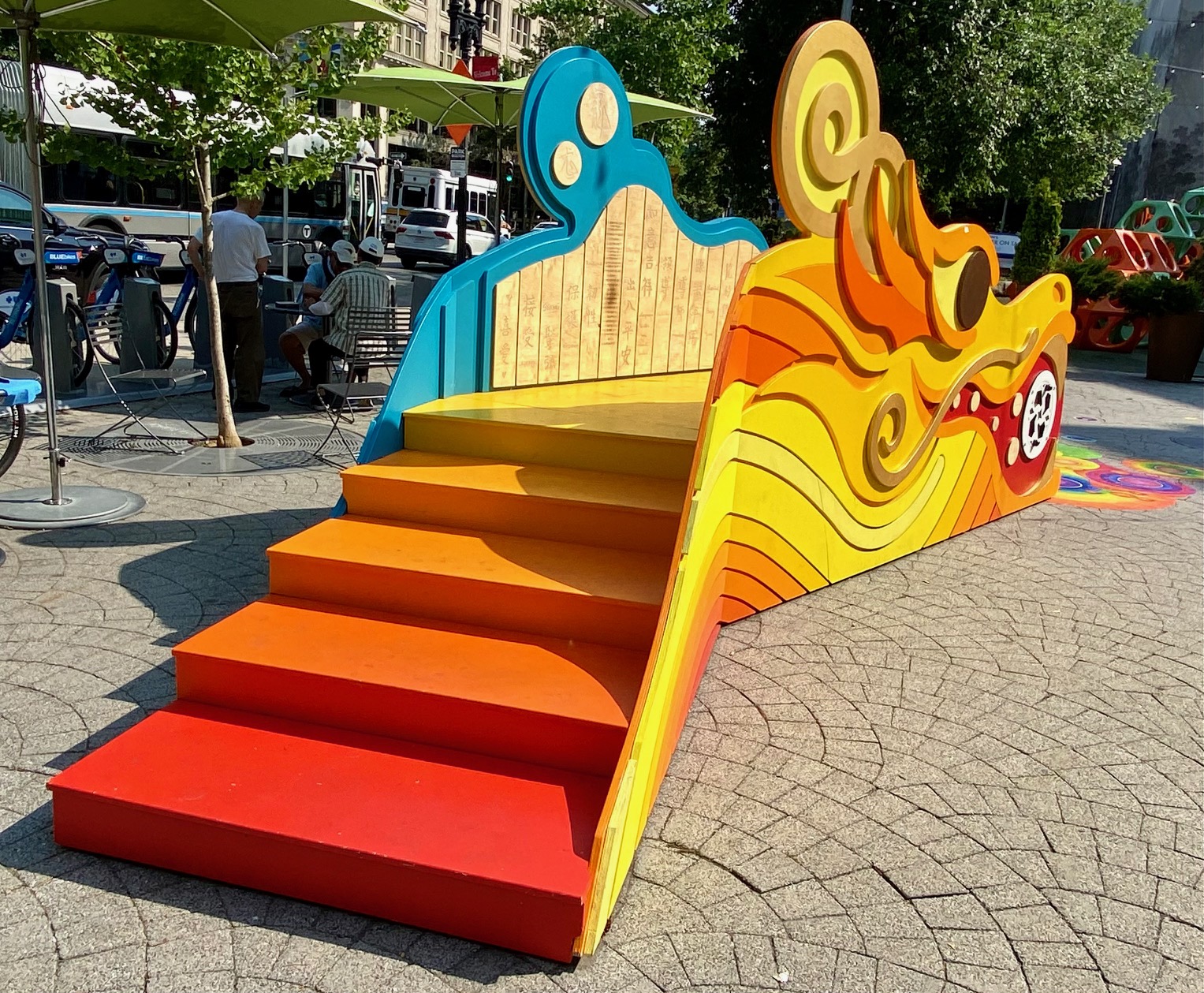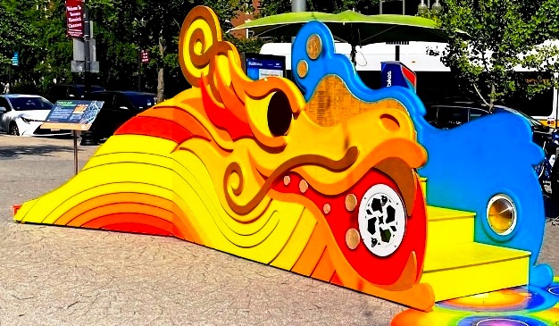 “Keeping joy and play at the center of her work, the artist invites viewers to engage with the installation in multiple ways: you can walk up the sculpture as if riding on the dragon, explore neighborhood surroundings through a rainbow-colored kaleidoscope feature, or play with the built-in hand drum.” (quote from Rose Kennedy Greenway, Year of the Dragon, Ponnapa Prakkamakul )