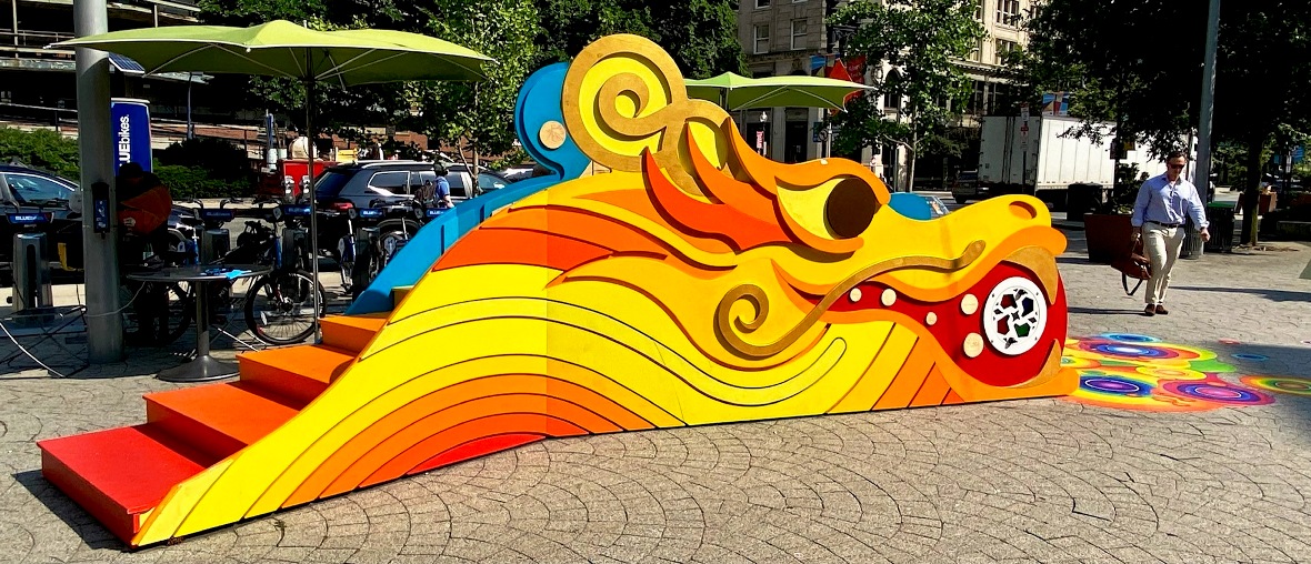 “The artist invited multigenerational Chinatown community members to collectively design the dragon’s visual form, colors, and magical qualities through a workshop series.“(quote from Rose Kennedy Greenway, Year of the Dragon, Ponnapa Prakkamakul )