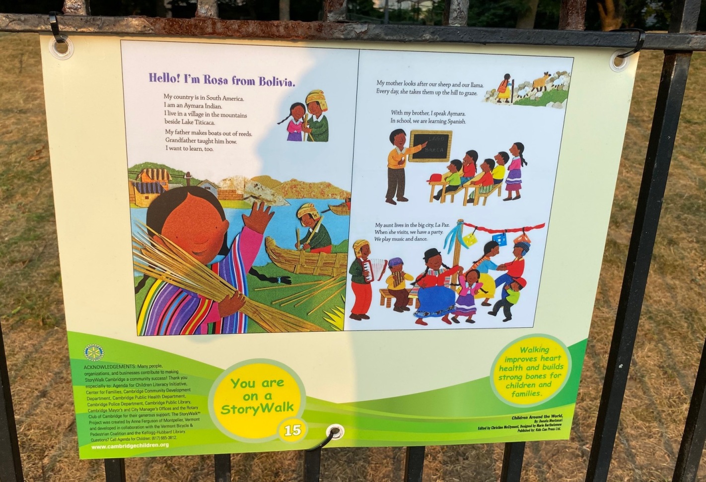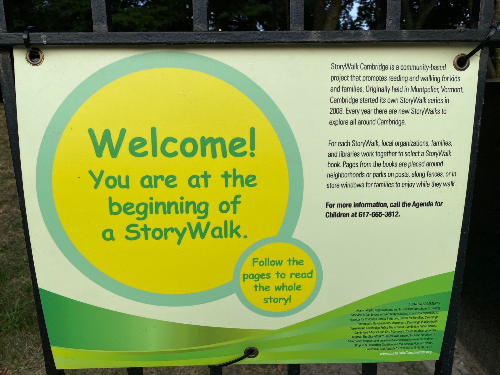 “StoryWalk – A popular family activity that promotes reading and walking. Pages from a children’s book are posted throughout a neighborhood or park, and families walk from one posted page to the next to finish the story.” ( quote from community programs listed by Let’s Talk in Cambridge)
