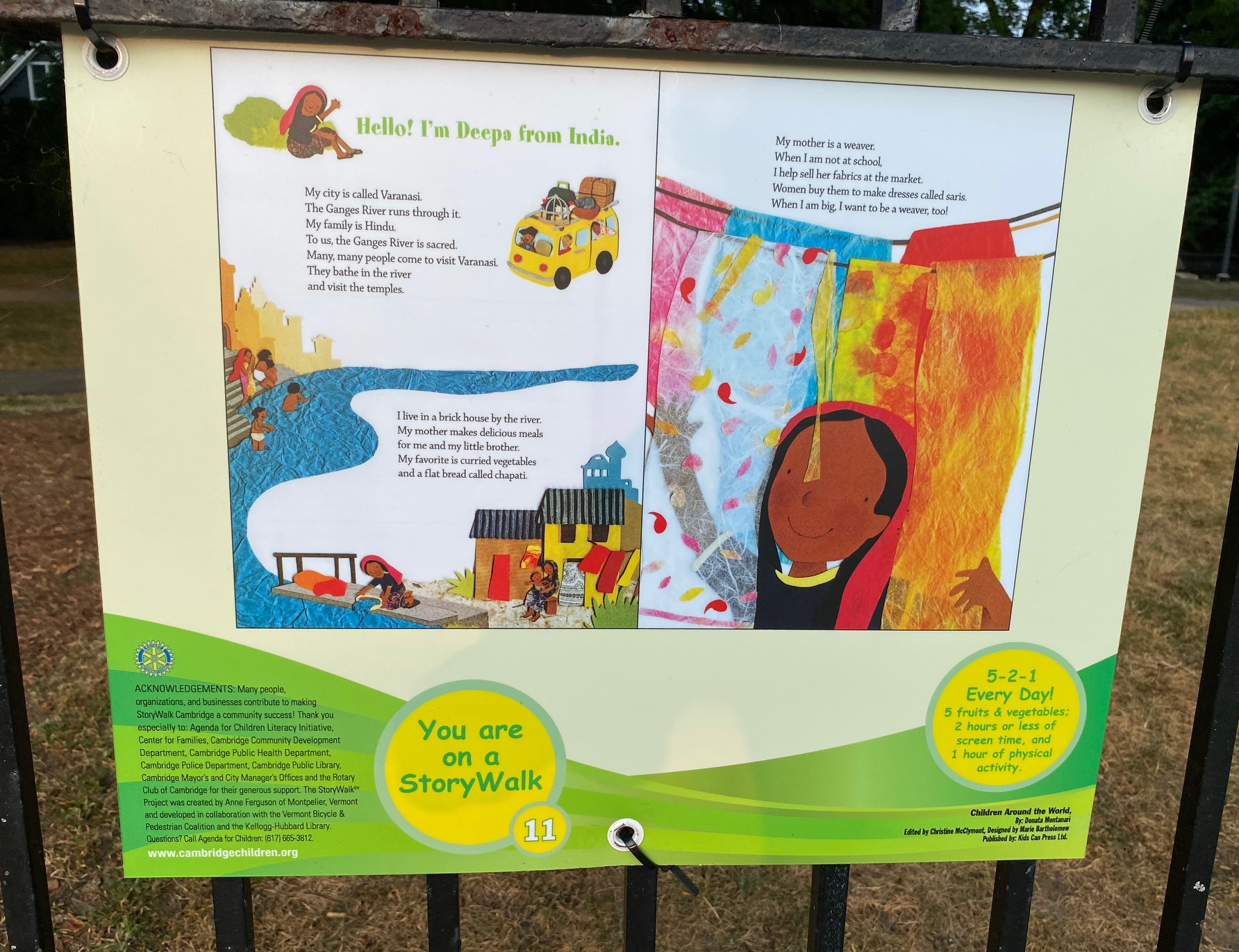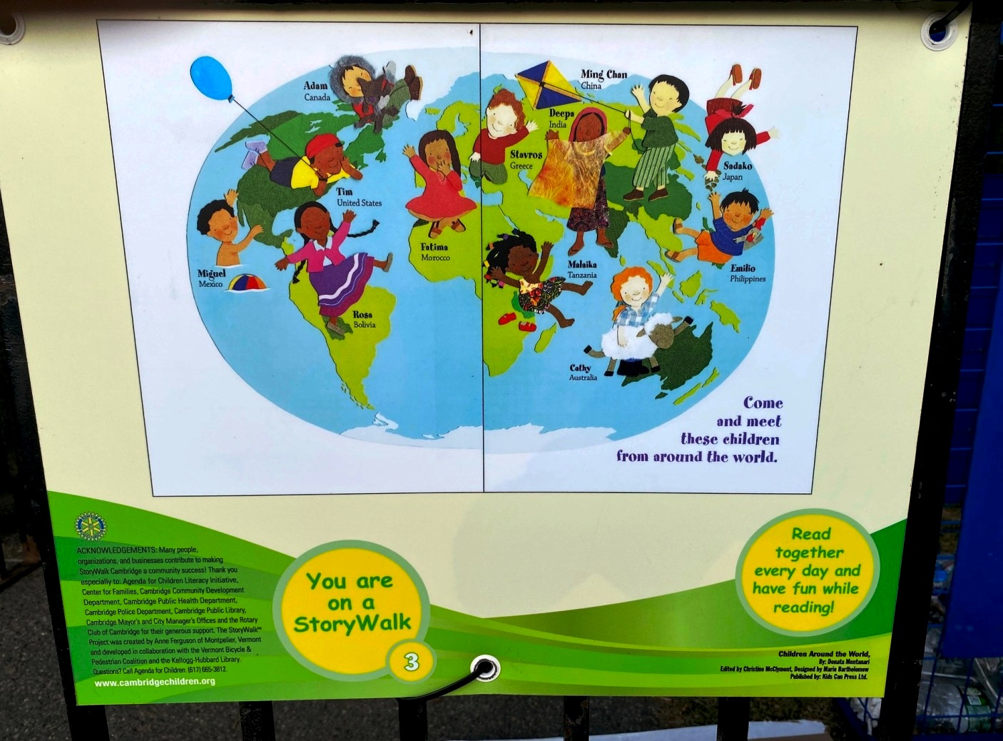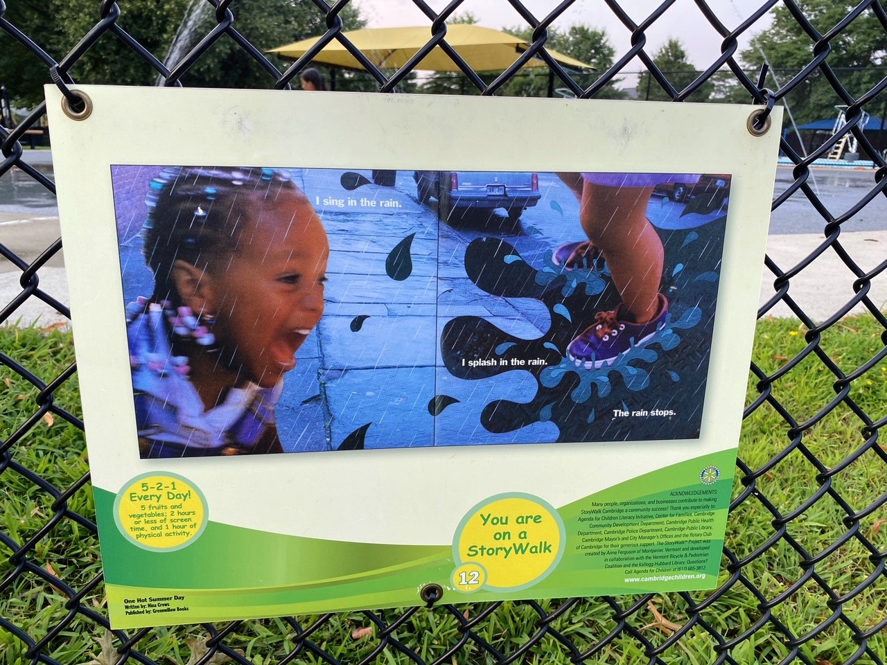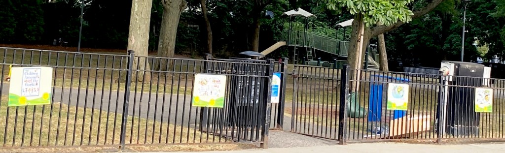 This post is a quick follow-up to STORYWALKS DISPLAY BOOK ARTS IN PARKS WORLDWIDE, INCLUDING CAMBRIDGE with two examples of the eight StoryWalks in Cambridge listed for this summer, 2024.* Placement of book pages at children’s eye levels along fences around playgrounds helps relate their outdoor play to themes of selected books. *StoryWalks in Cambridge are sponsored by Let’s Talk/Agenda for Children Literacy Initiative and the Center for Families.