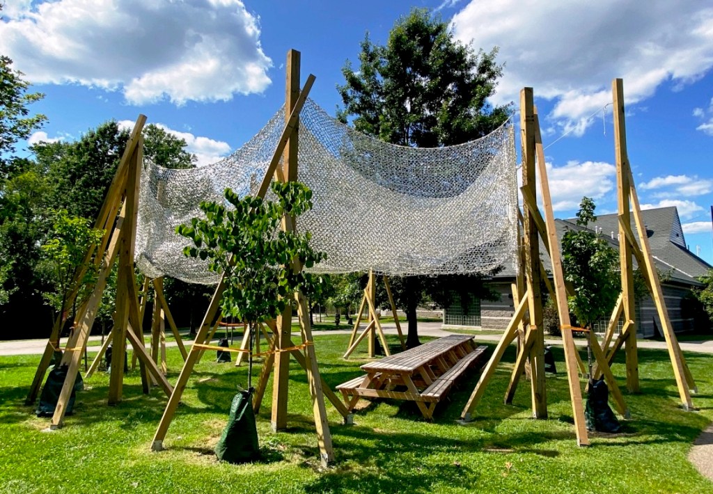 “Growing Shade” by Alejandro Saldarriaga and Northeastern University, Russell Field between Rindge Avenue, and Harvey Street, North Cambridge: