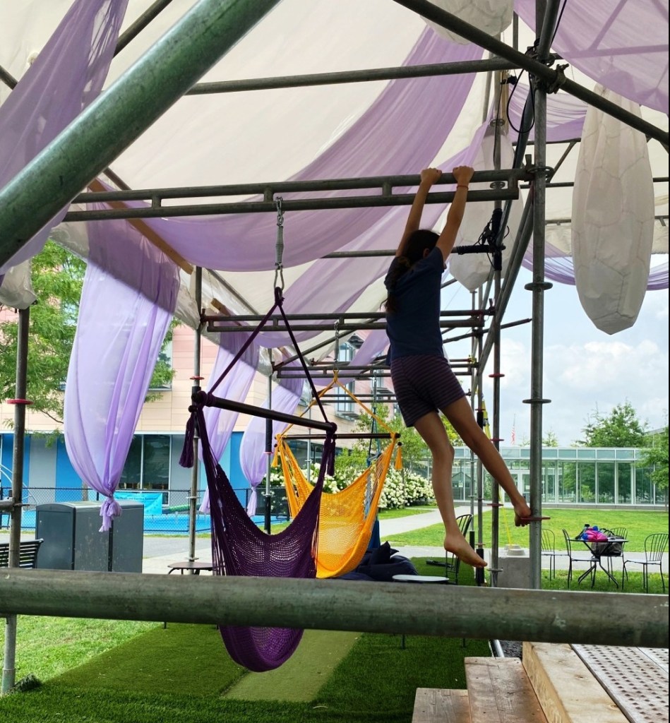 “In spaces called Shade – structures designed by a local youth committee with the same name – teens can find hammocks, beanbag chairs, and even outdoor movies.” ( quote from CBS news; Cambridge combines art and social justice to give teens their own space, Aug 14, 2024, By Laura Haefeli)