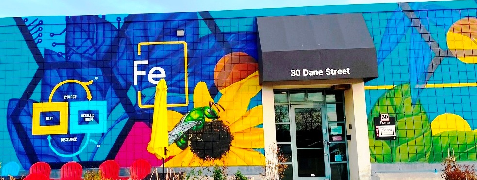 “The mural’s hexagonal pattern, inspired by Greentown Labs’ logo and Form’s battery technology, represents the essential role Somernova’s tenants play in fighting the harmful ecological effects of energy extraction and in advancing clean energy technology. ” (quote from “Mural showcasing the science and impact of climate change at Somernova unveiled” The Somerville Times, June 2024)
