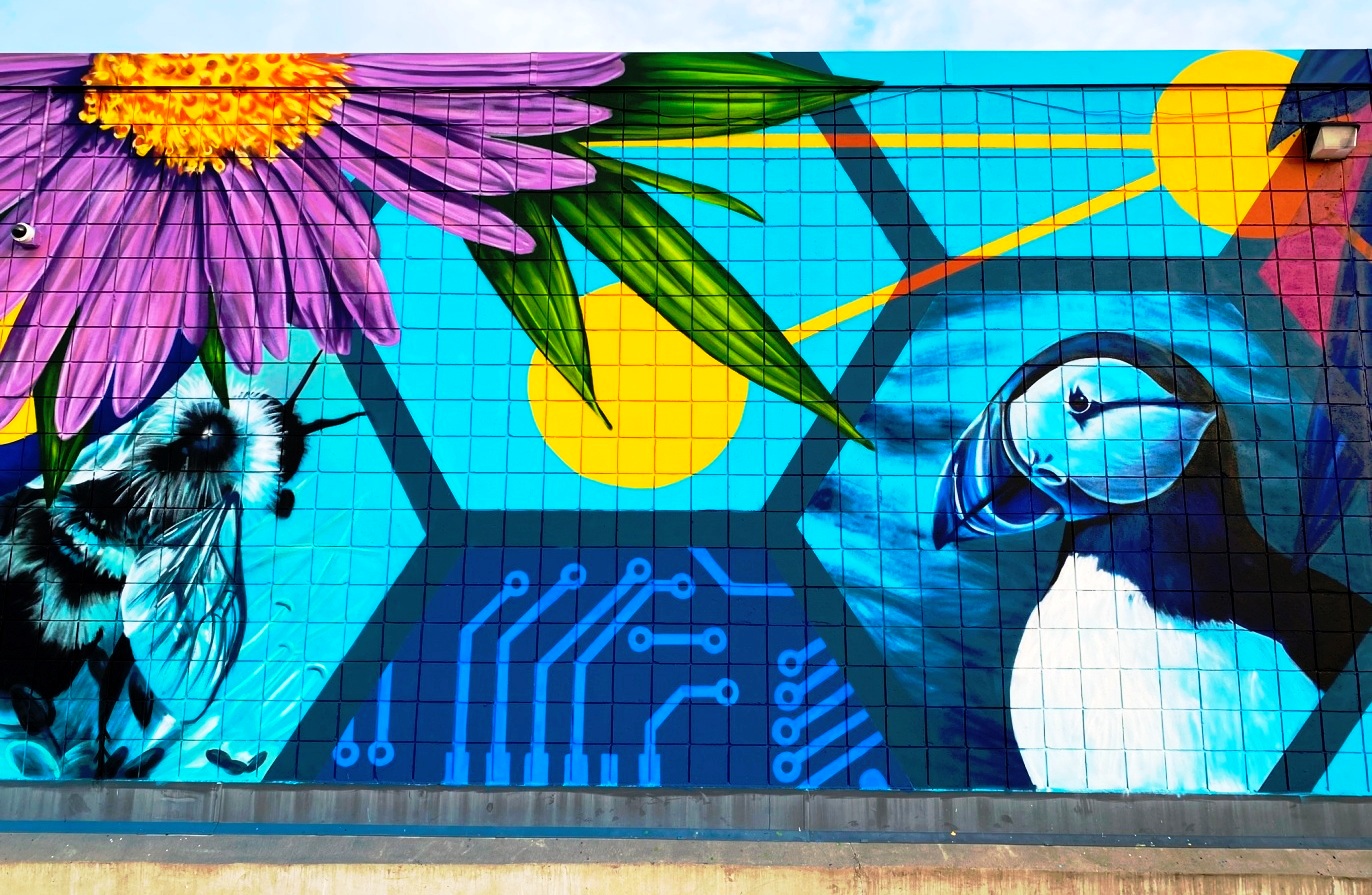 ““As an artist, my work aims to bridge the gap between complex scientific topics and the general public,” Tuttle said. “My new mural at Somernova highlights the connectivity between our local ecosystems and the role of innovative, clean technologies that aid in the preservation of biodiversity.”“(quote from “Mural showcasing the science and impact of climate change at Somernova unveiled” The Somerville Times, June 2024)