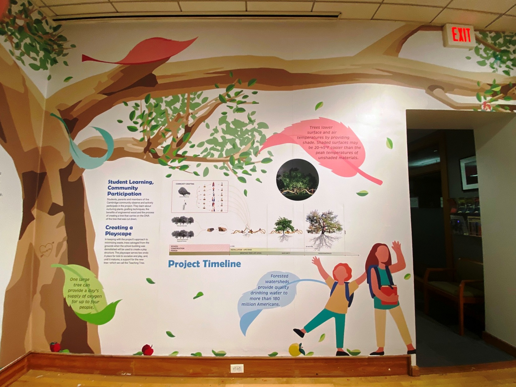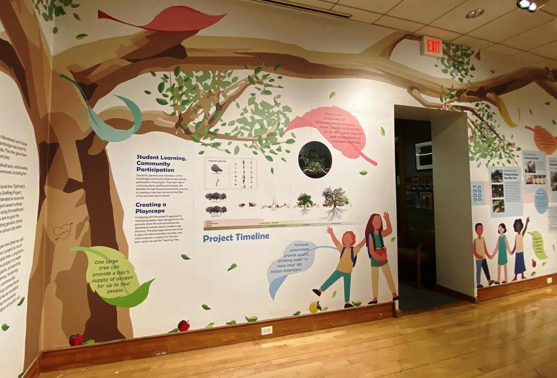 “The project is inspired by the apple tree—beloved for many years as a place to congregate, play and create memories—that was removed as part of the reconstruction of the school,” IKD said. “By using cuttings that were taken from the tree just before removal, the project seeks to literally regrow a new tree from the old tree, educating and engaging students through the collective process of nurturing the tree from infancy to adolescence to maturity.” (quote from Cambridge Arts, What’s New, Tobin)