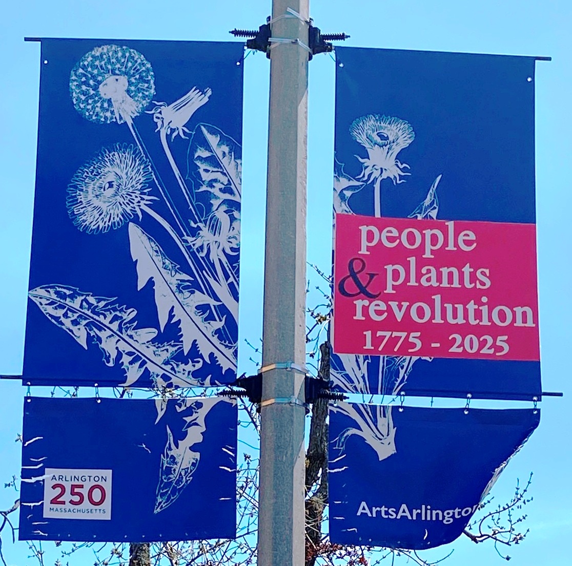 “People, Plants & Revolution is the theme for a series of colorful banners and an audio tour commemorating the 250th anniversary of the American Revolution in Arlington, MA. Organized by ArtsArlington, the banners portray the landscape elements and important plants that shaped life in 1775 in Menotomy, as the town was known at the time, a colonial farming village.” (quote from “People, Plants & Revolution” Public Art Banners and Audio Tour, Arts Arlington Calendar)