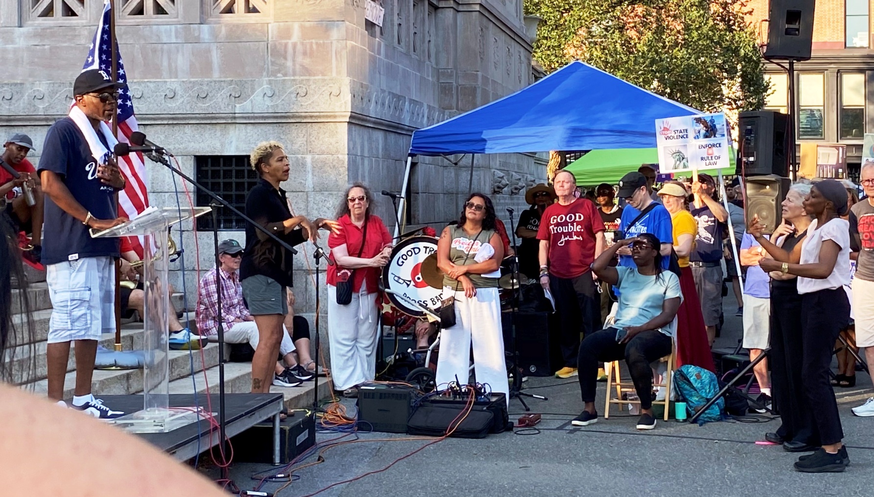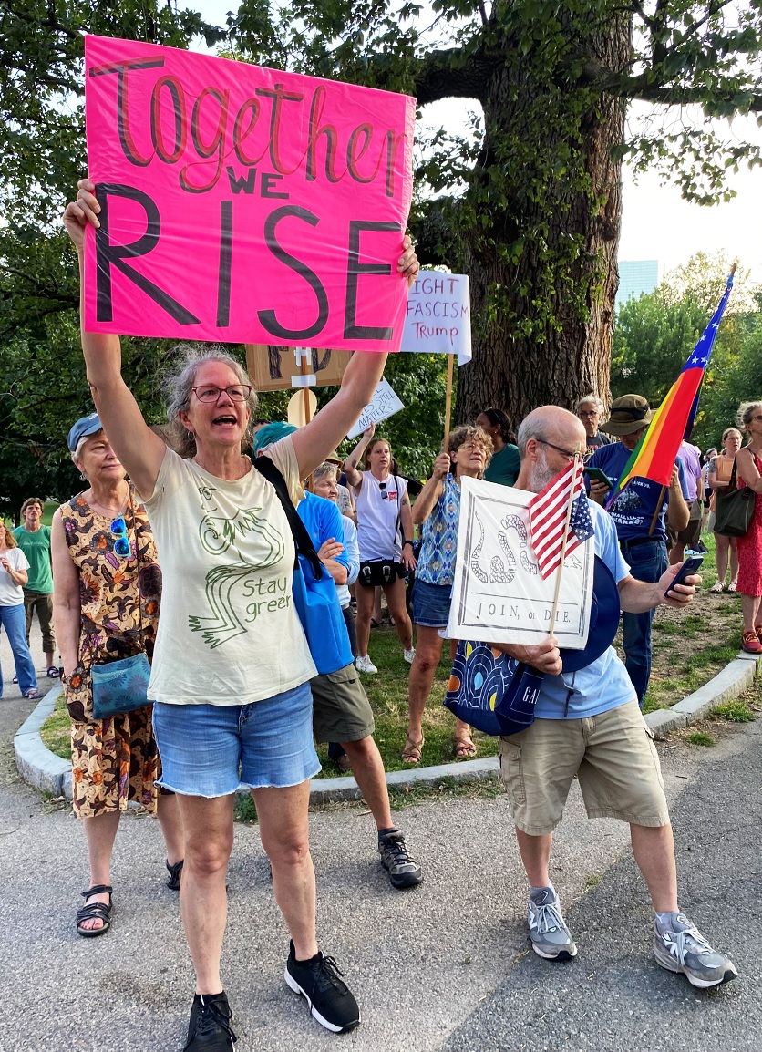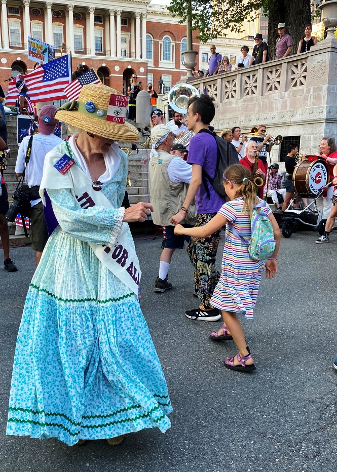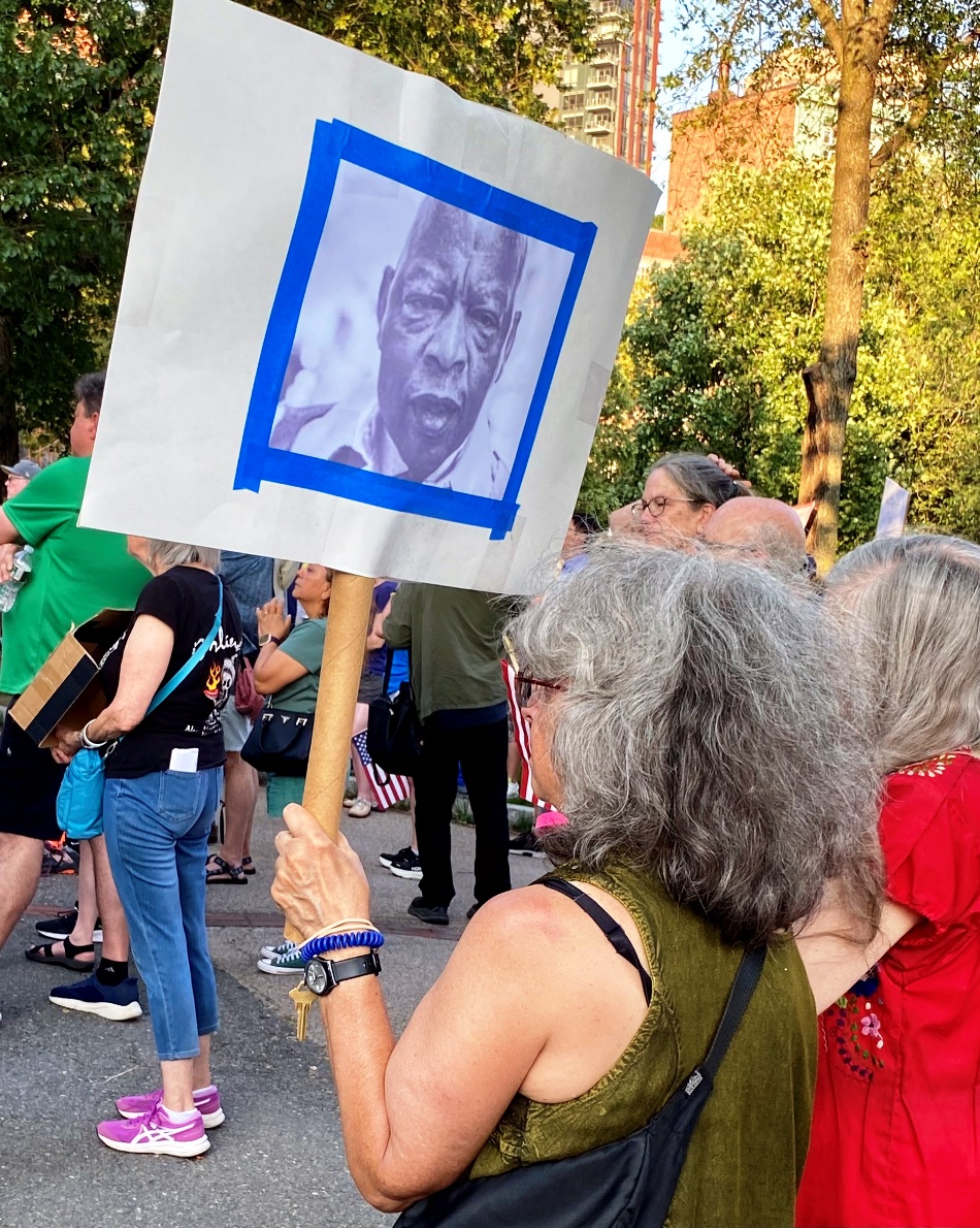 This Boston rally, July 17, in memory of John Lewis, drew on many ways to make good trouble: posters, stencils, bubbles, costumes, singing, speaking, signing, dancing, chanting, painting, and much more. Let photos and quotes here suggest the event’s energy and emotions.
