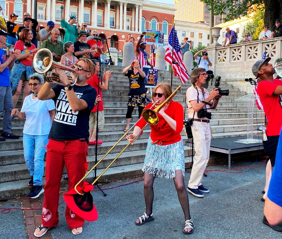 “The Good Trouble Brass Band is a large, not-for-profit, “raucous, stomp-your-foot-and-belt-out-the-choruses” activist New Orleans-style street band based in Somerville and Cambridge, Massachusetts. Our mission is to fight for social justice causes and support community events while having fun and spreading joy through our music.“