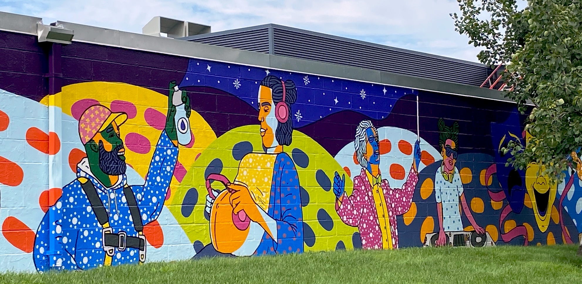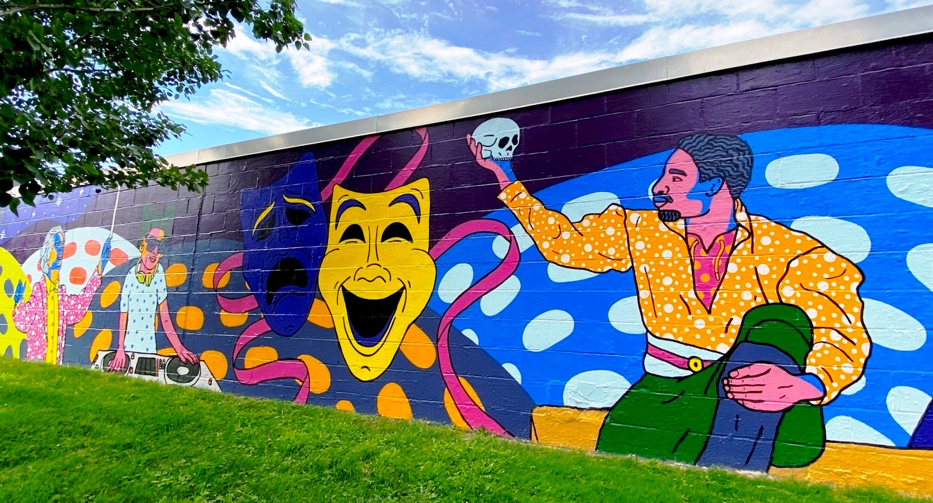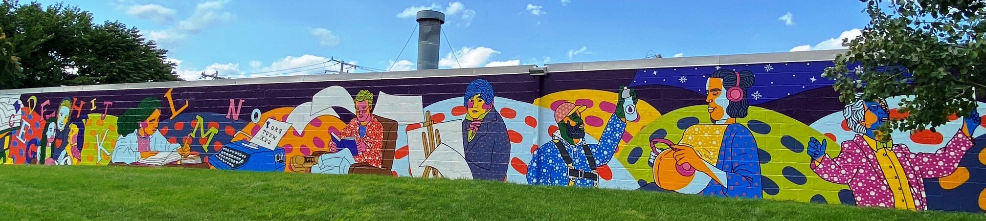 Completed and celebrated in the summer of 2024, this exuberant extended mural rewards repeated visits. Quotes, photos, and links here support this promise.