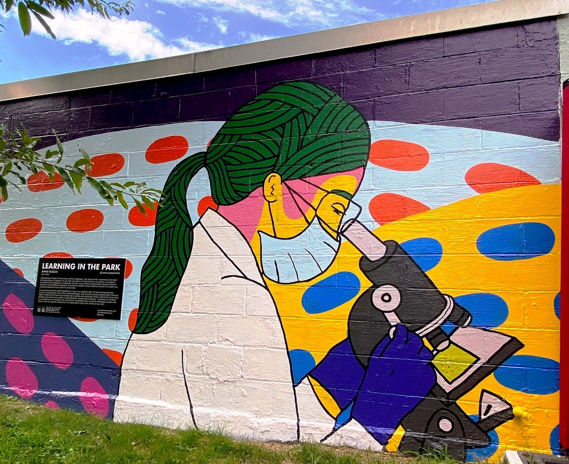 “Welcoming visitors to the future Allston Greenway, this mural titled “Learning in the Park”, by Anna Dugan celebrates the joy and inclusivity of education in all forms. It illustrates the interconnectedness of literature, the arts, and science in education through vibrant portraits and important moments in Boston’s history while inspiring viewers to reflect on lifelong learning and access to education.“(quote from Learning in the Park mural by Anna Dugan, Zone 3 )
