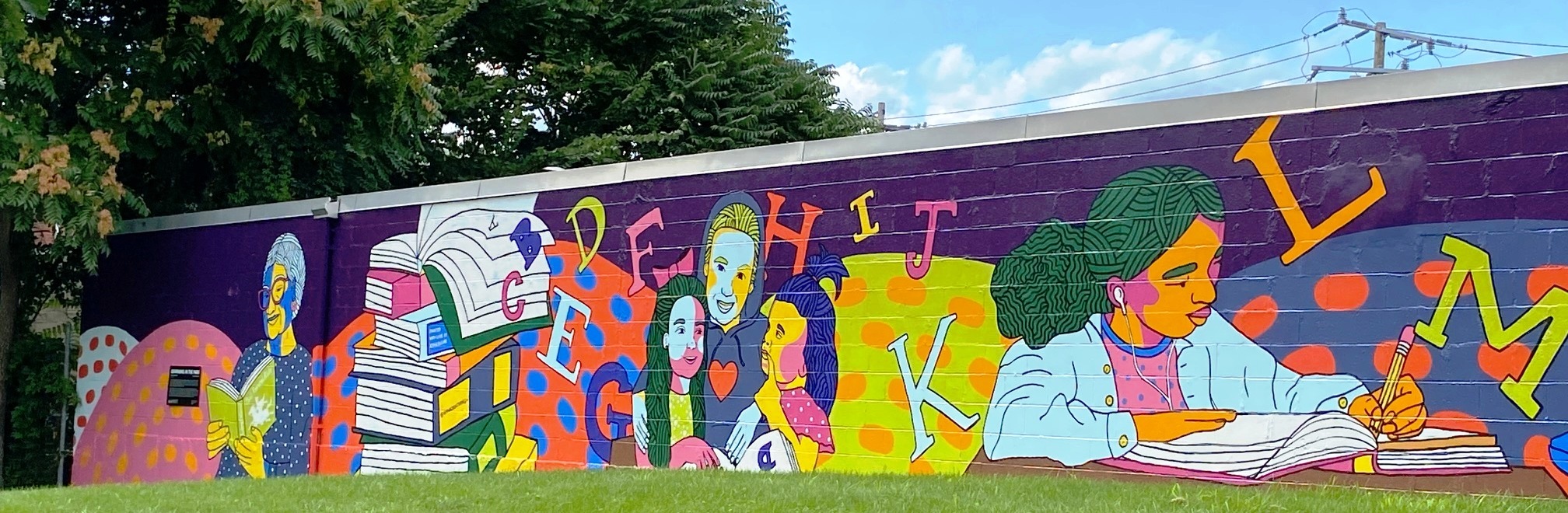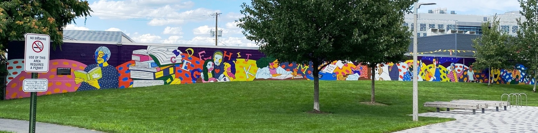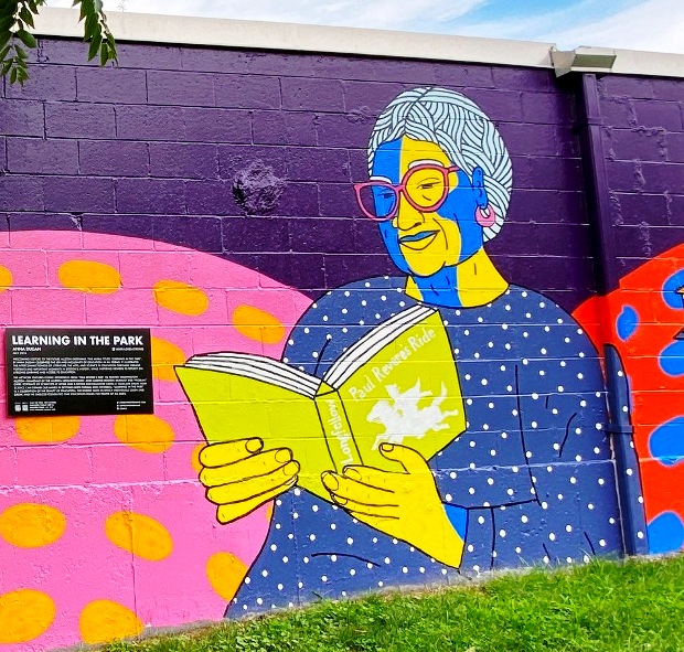 “Learning in the Park” is a celebration of the beauty of education, the diverse ways in which individuals learn and grow, and the endless possibilities that education holds for people of all ages.” (quote from Learning in the Park mural by Anna Dugan, Zone 3 )