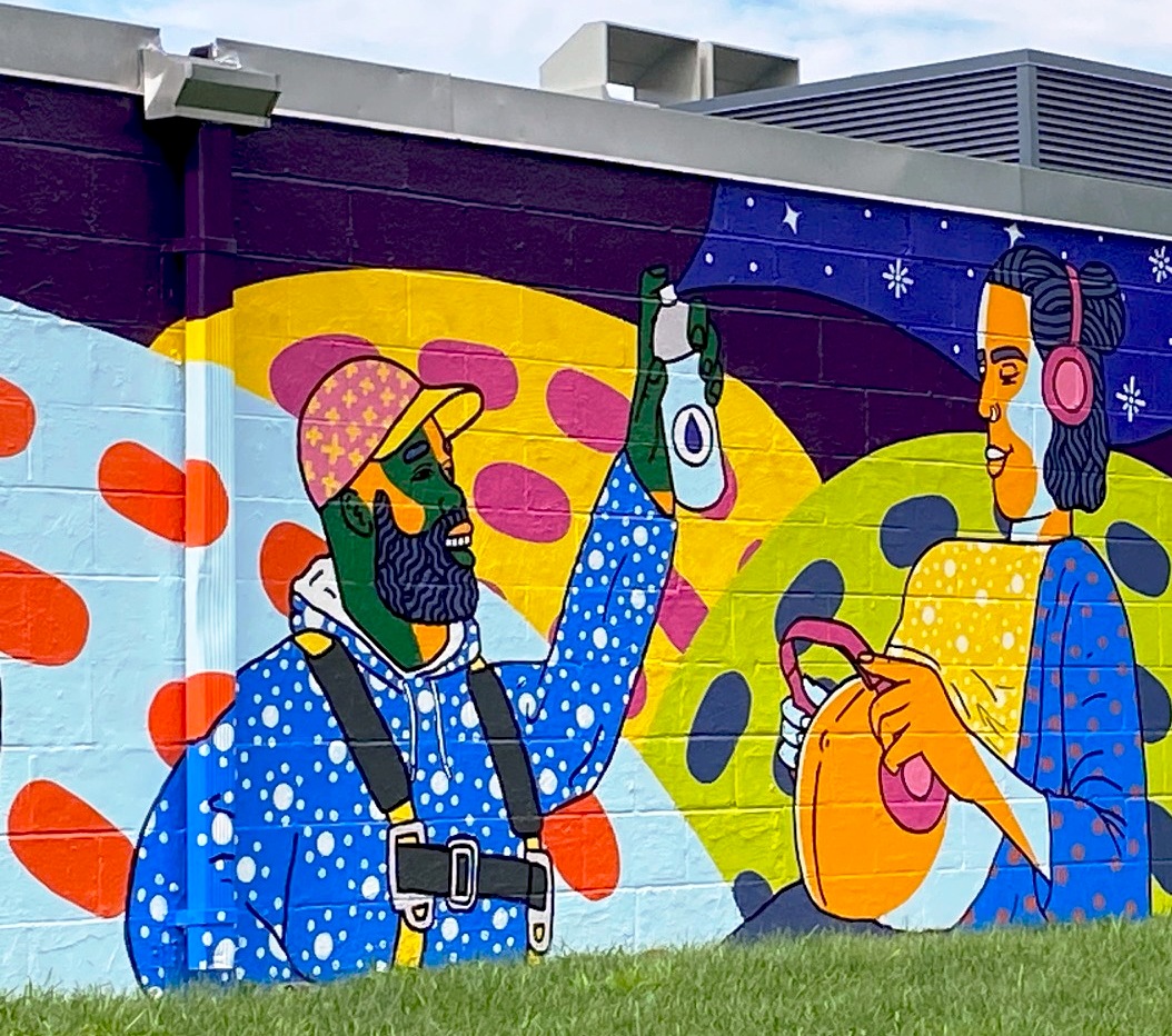 “She (Anna) dives into these complex themes through a lens of joy – using vibrant colors, patterns, and storytelling. Her unique work is easy to recognize, combining graphic illustrative styles with modern folk art inspirations. .”(quote from Learning in the Park mural by Anna Dugan, Zone 3 )