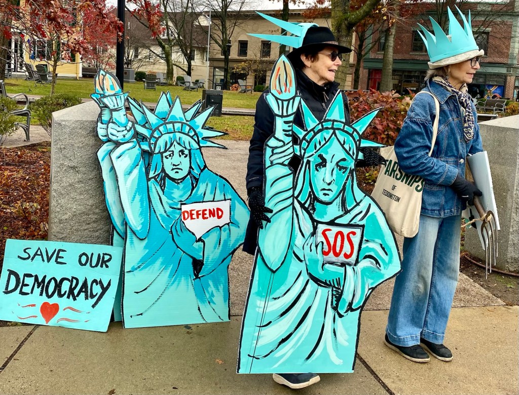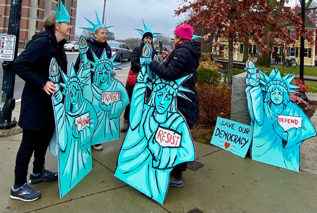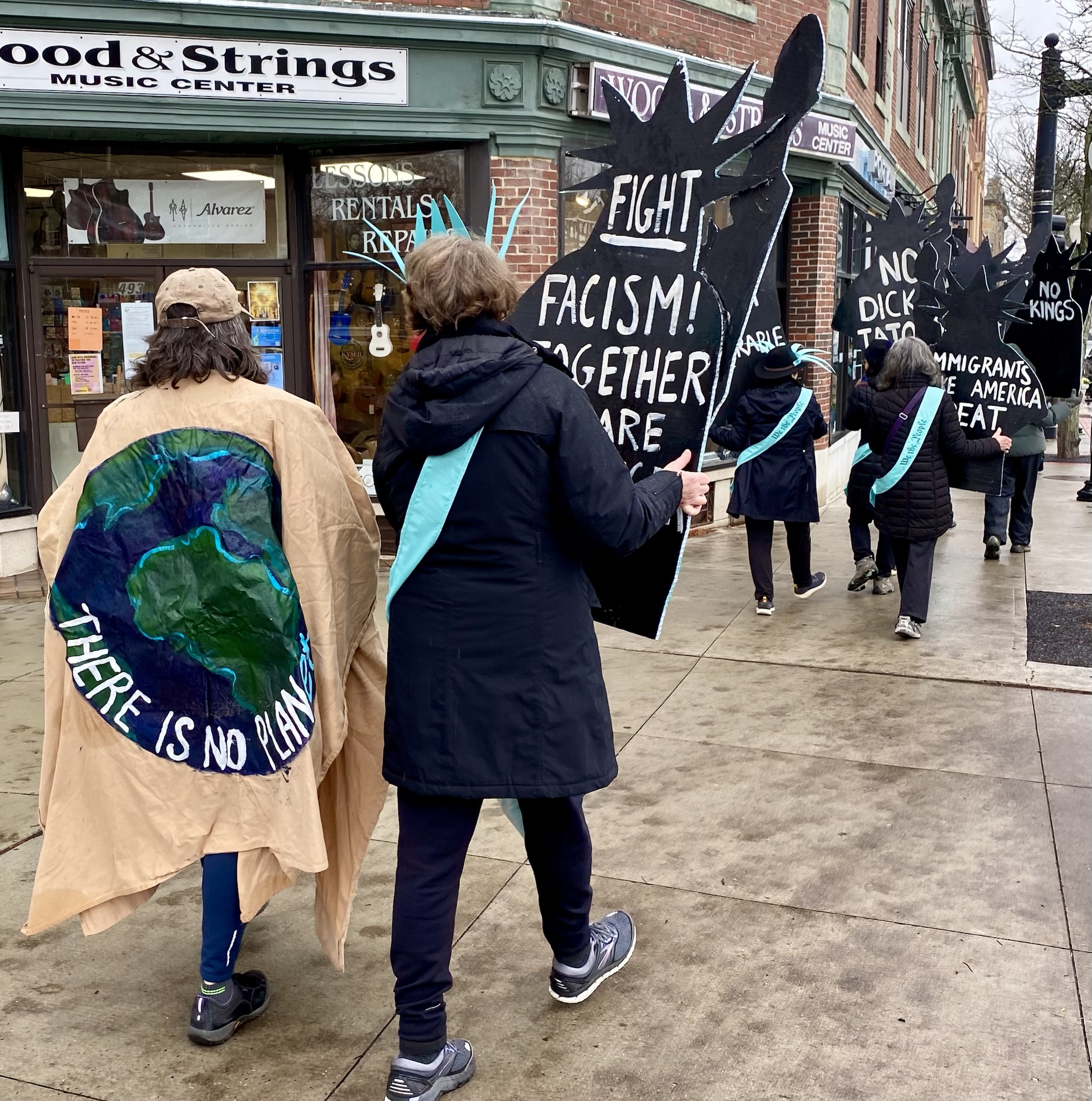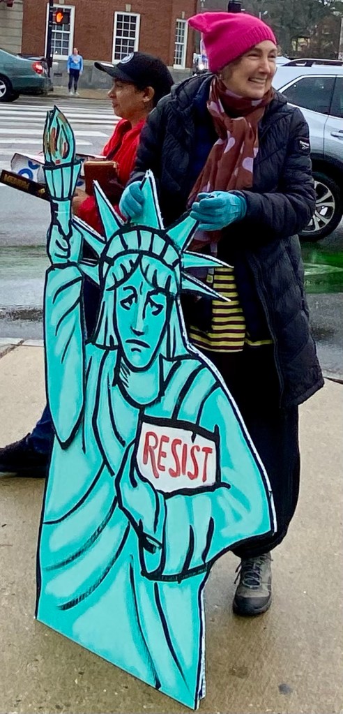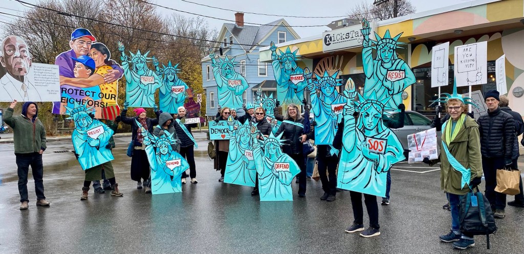 Liberty images, statements, and costumes created by a group of artists for the Boston No Kings Rally in October came together for Fall of Freedom, November 22 in Arlington. Their sense of purpose was strong and promising! These photos, quotes, and links should confirm that.
