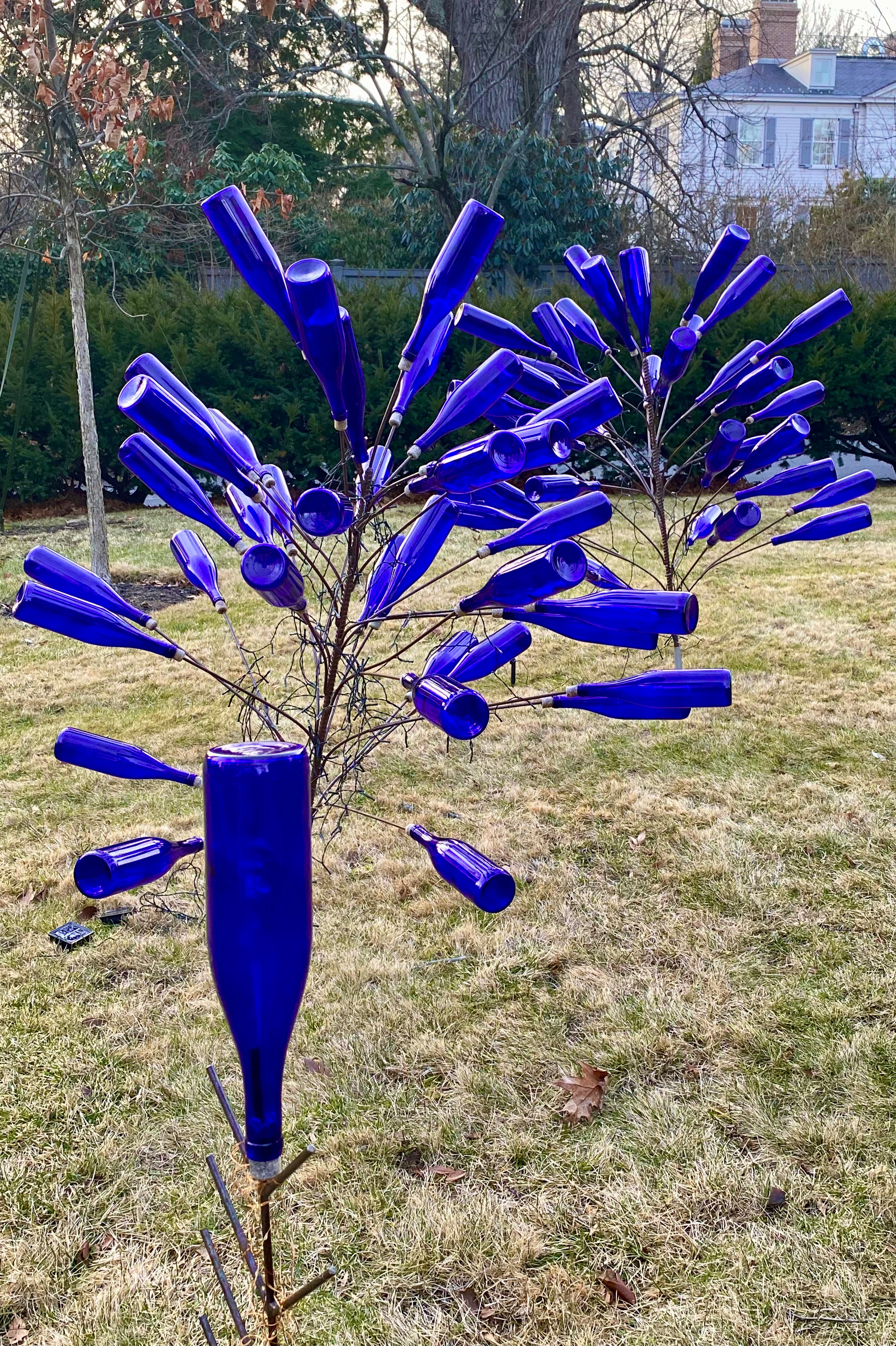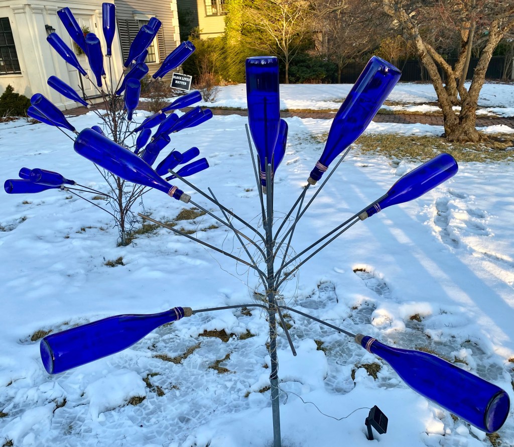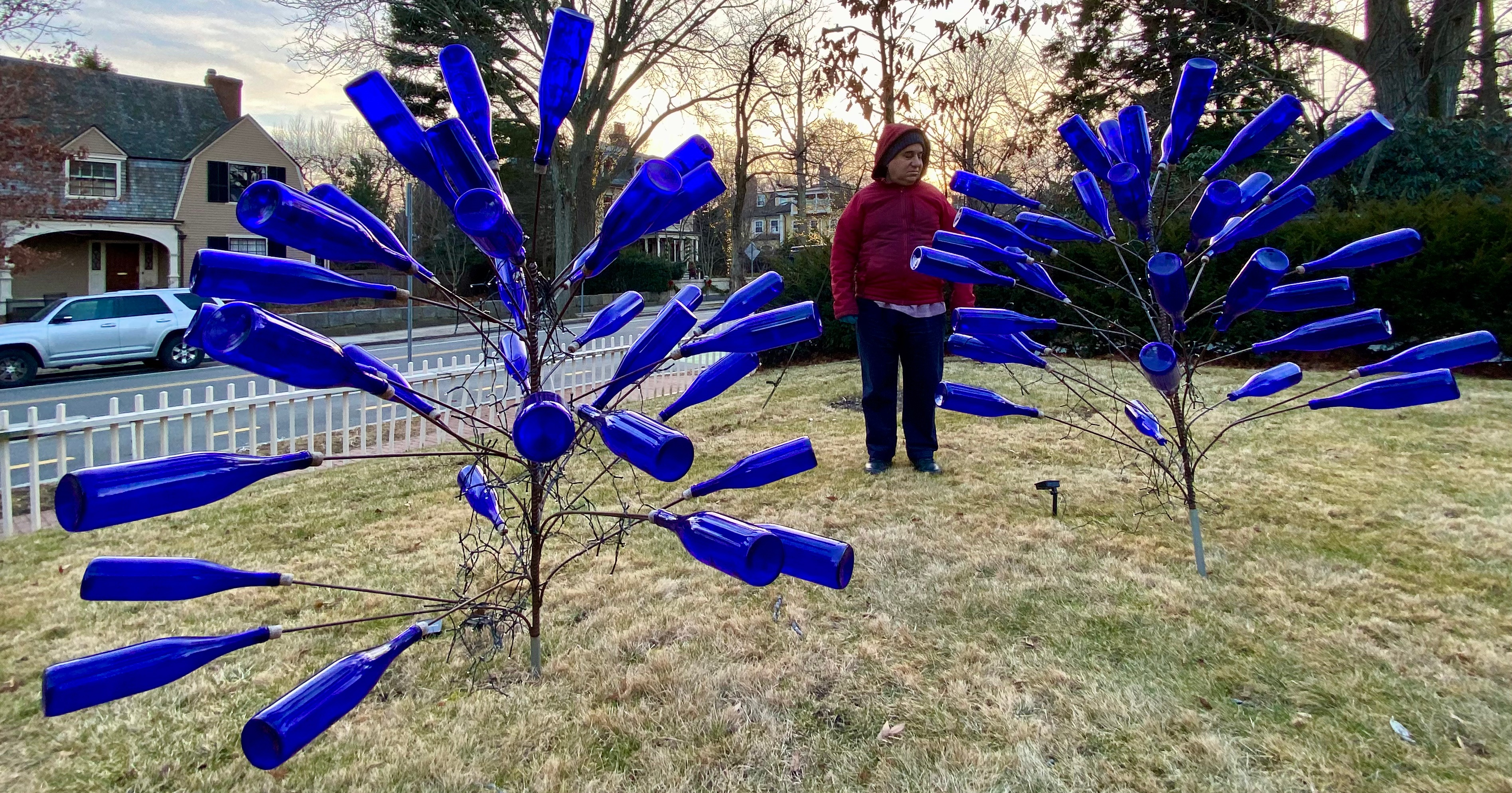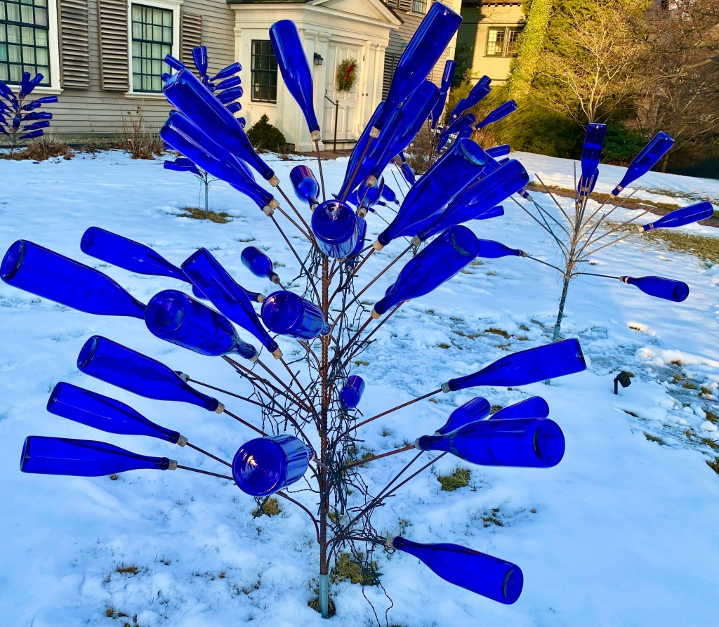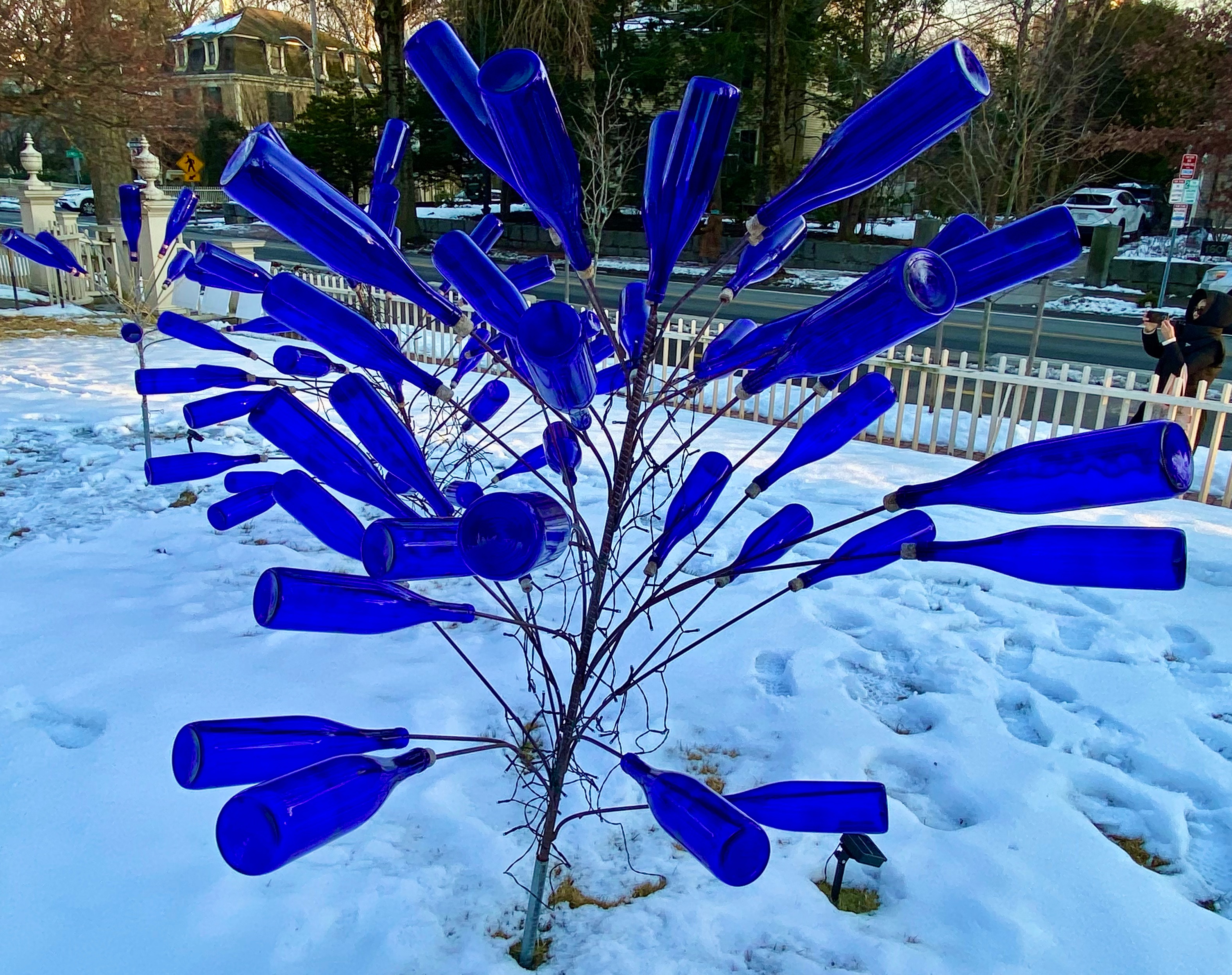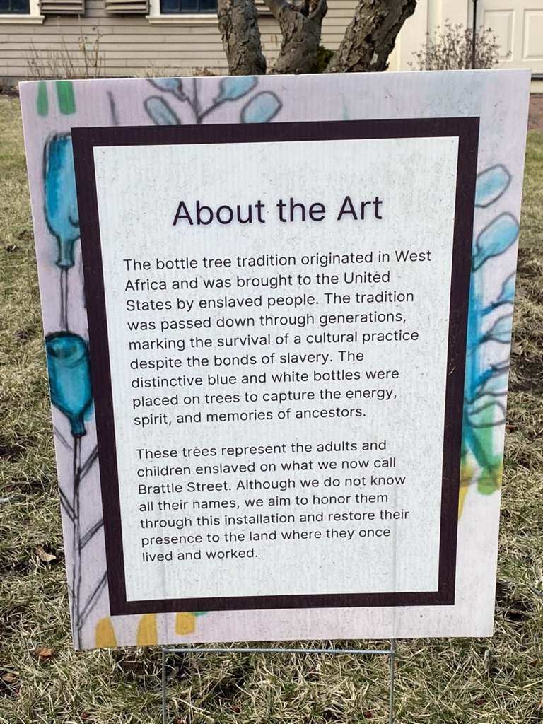 This meaningful installation ends on February 28, so I’m posting now without trying for photos that truly convey the beauty and significance of blue bottle trees! I hope the photos, quotes, and links here will guide you to visit in person if possible or at least appreciate the art, history, goals, and collaborative work on the lawn of 159 Brattle Street.