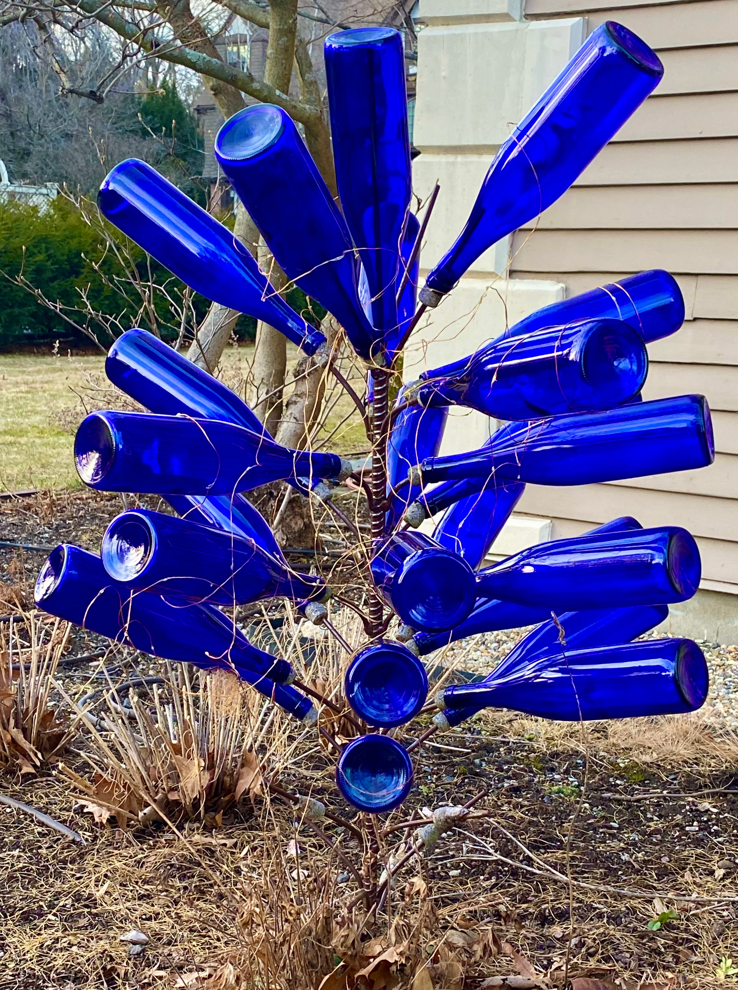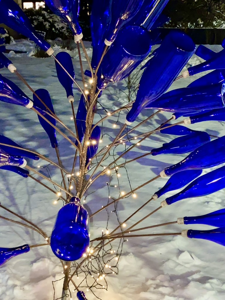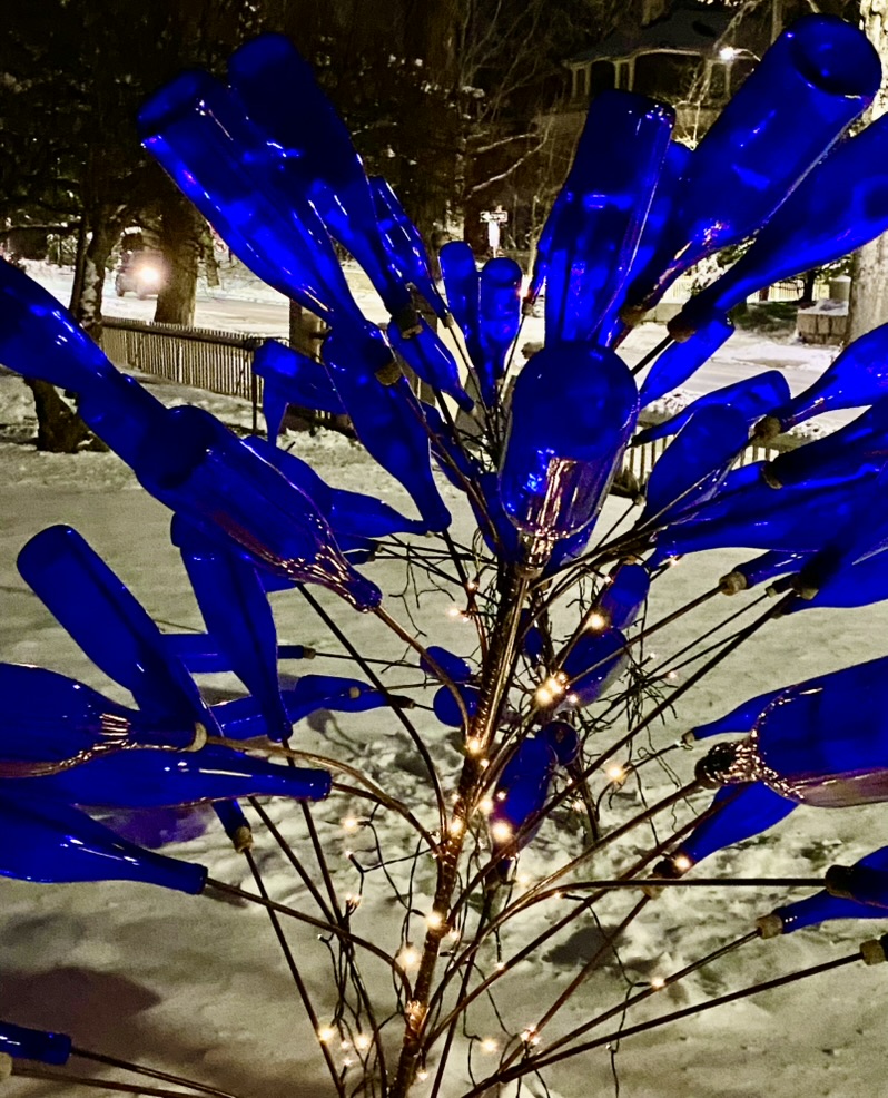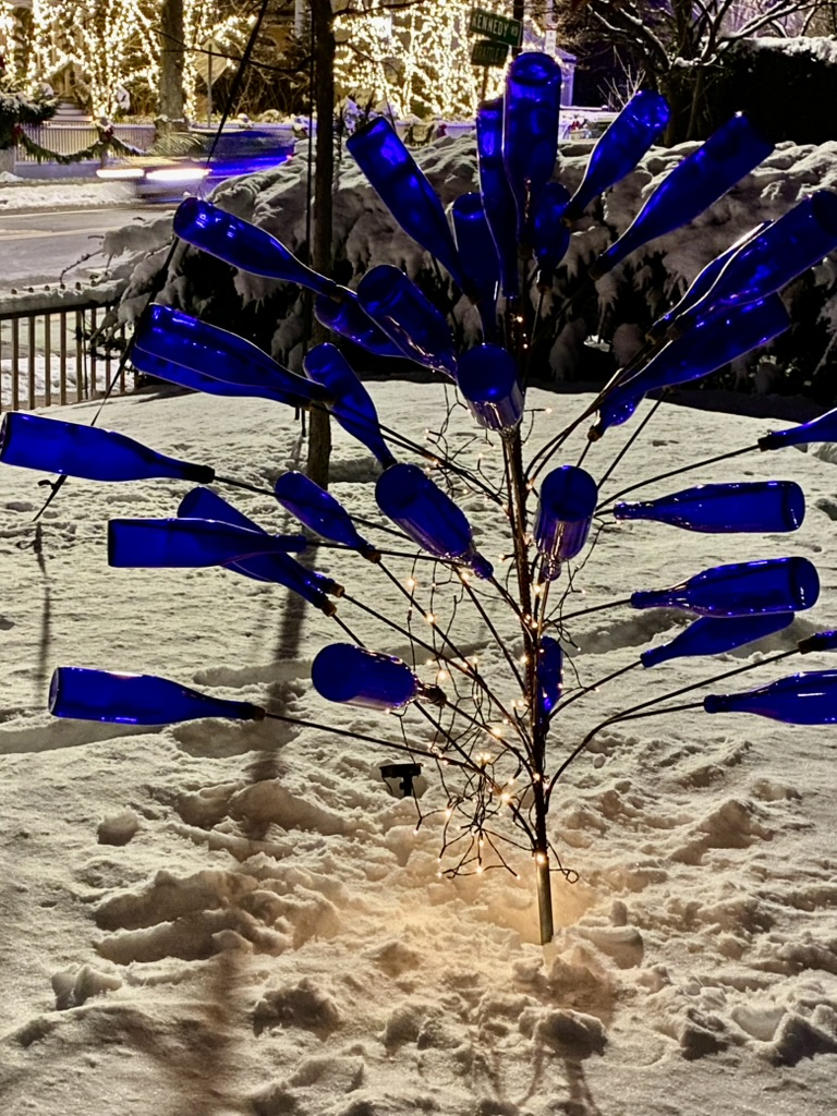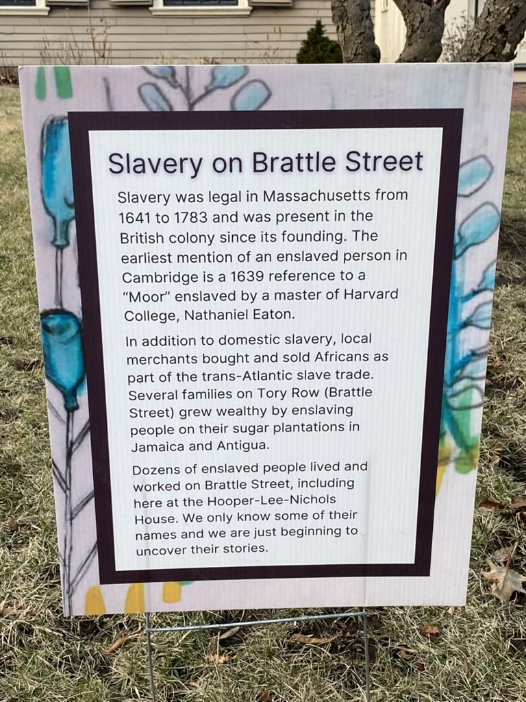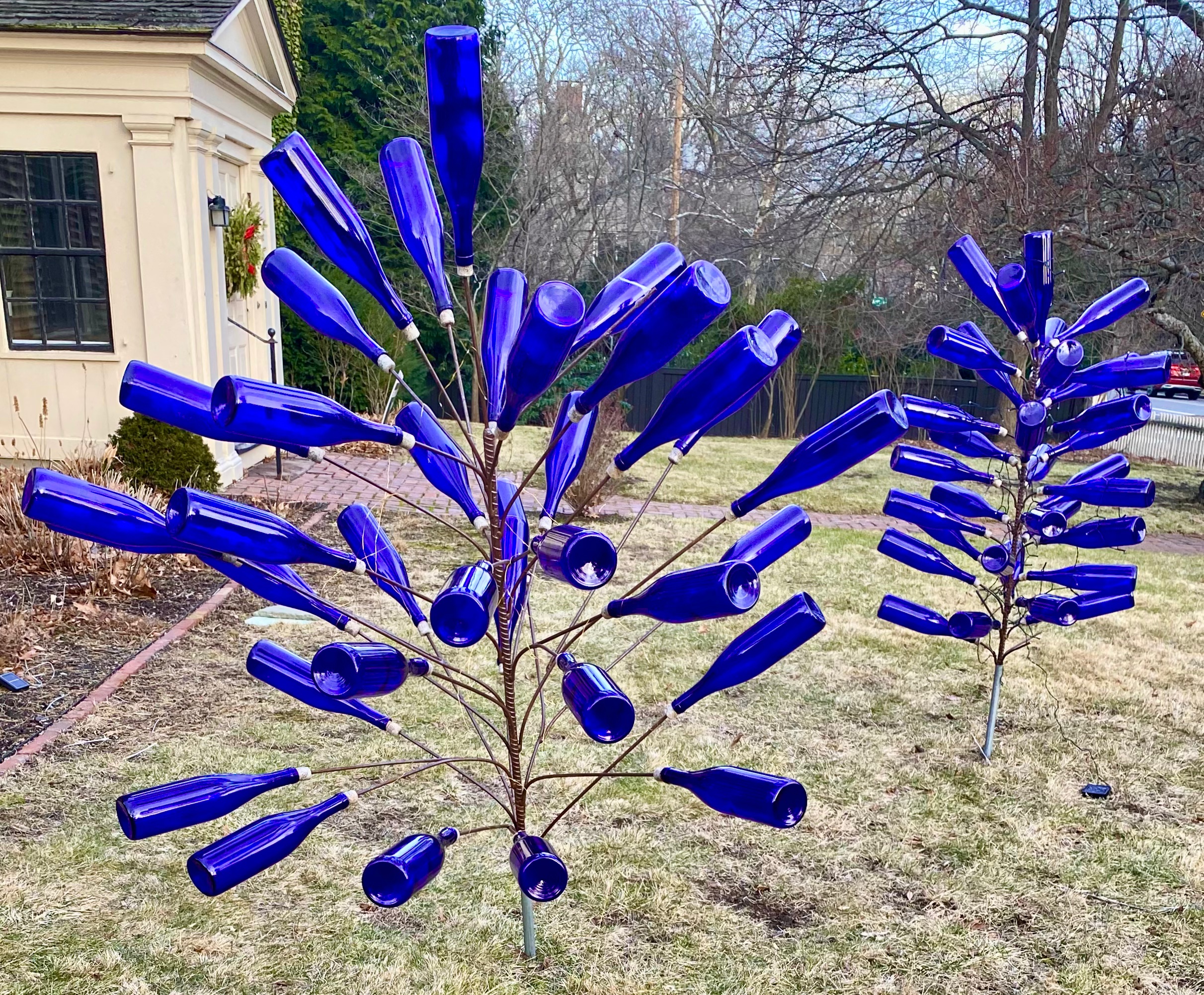 This meaningful installation ends on February 28, so I’m posting now without trying for photos that truly convey the beauty and significance of blue bottle trees! I hope the photos, quotes, and links here will guide you to visit in person if possible or at least appreciate the art, history, goals, and collaborative work on the lawn of 159 Brattle Street.