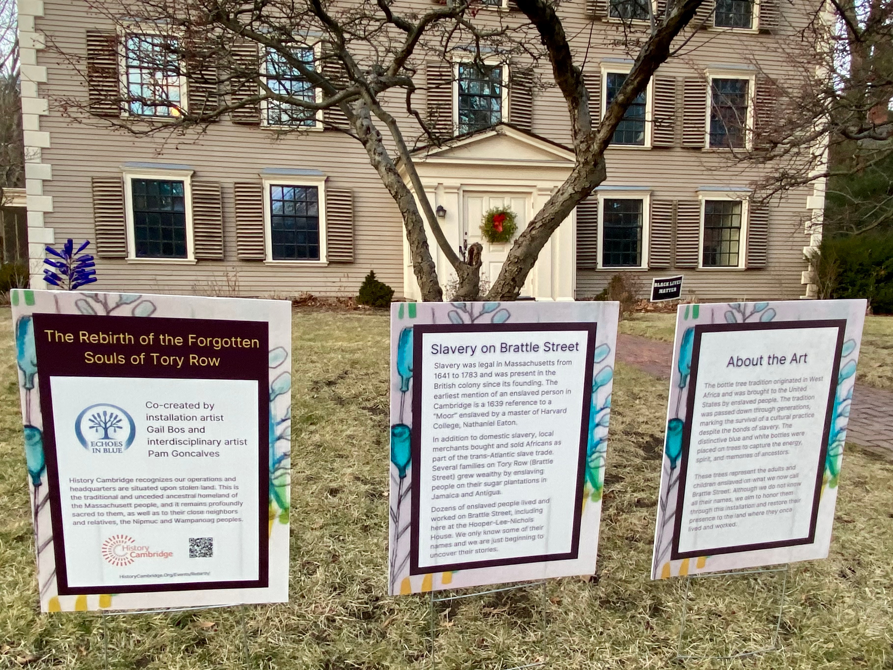 “The Rebirth of the Forgotten Souls of Tory Row is an outdoor installation co-created by installation artist Gail Bos and interdisciplinary artist Pam Goncalves, presented on the historic grounds of 159 Brattle Street, the current headquarters of History Cambridge. ” (quote from History Cambridge website, events, rebirth )