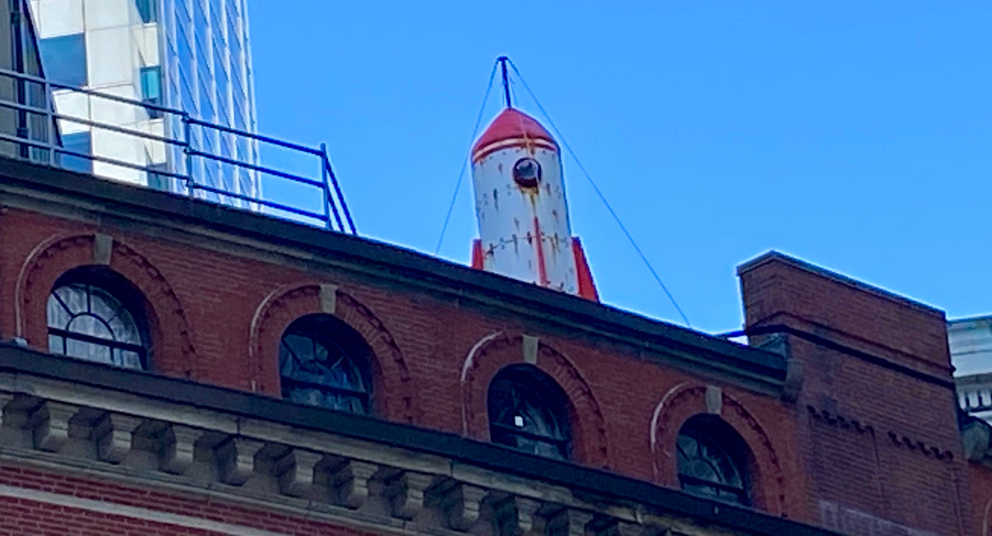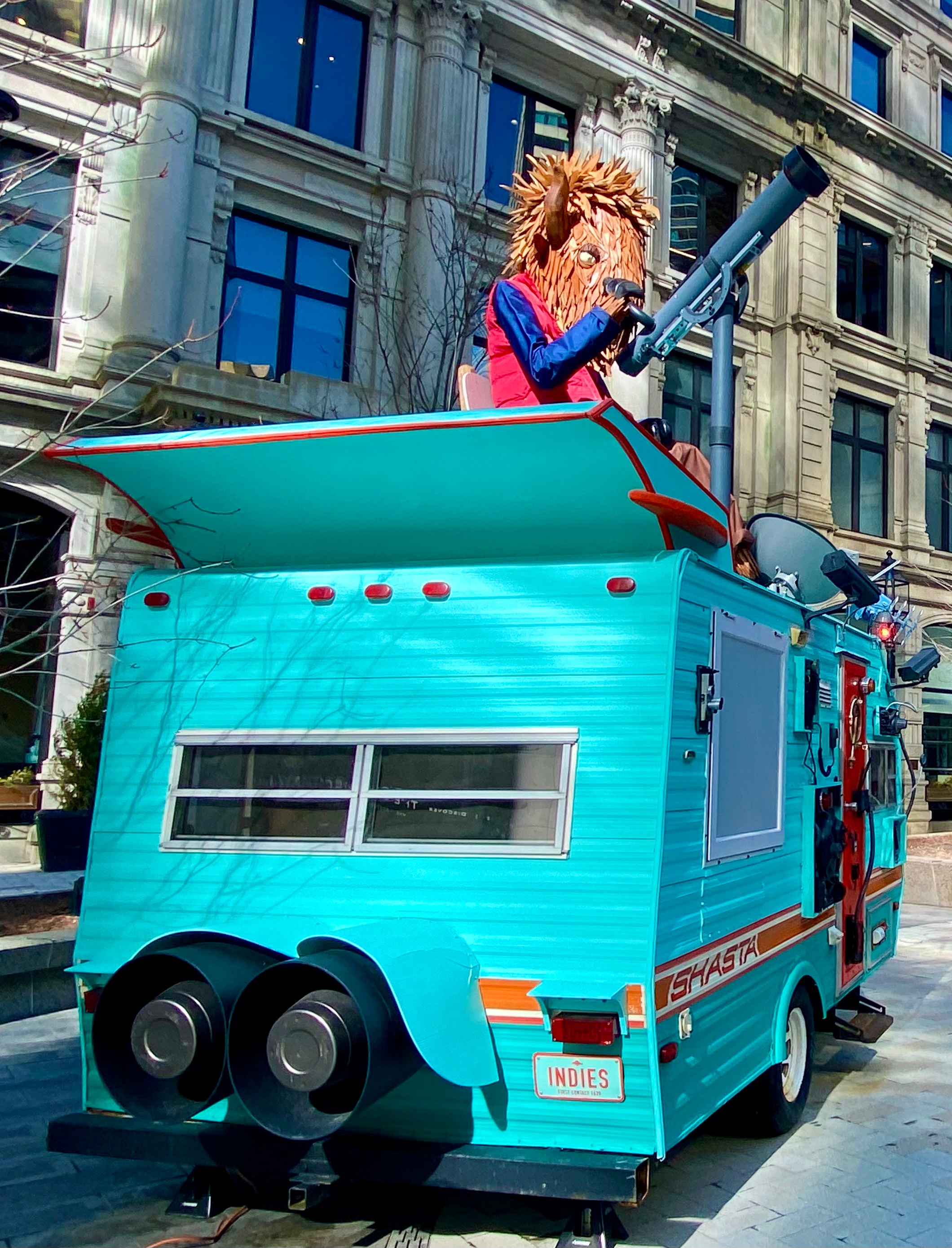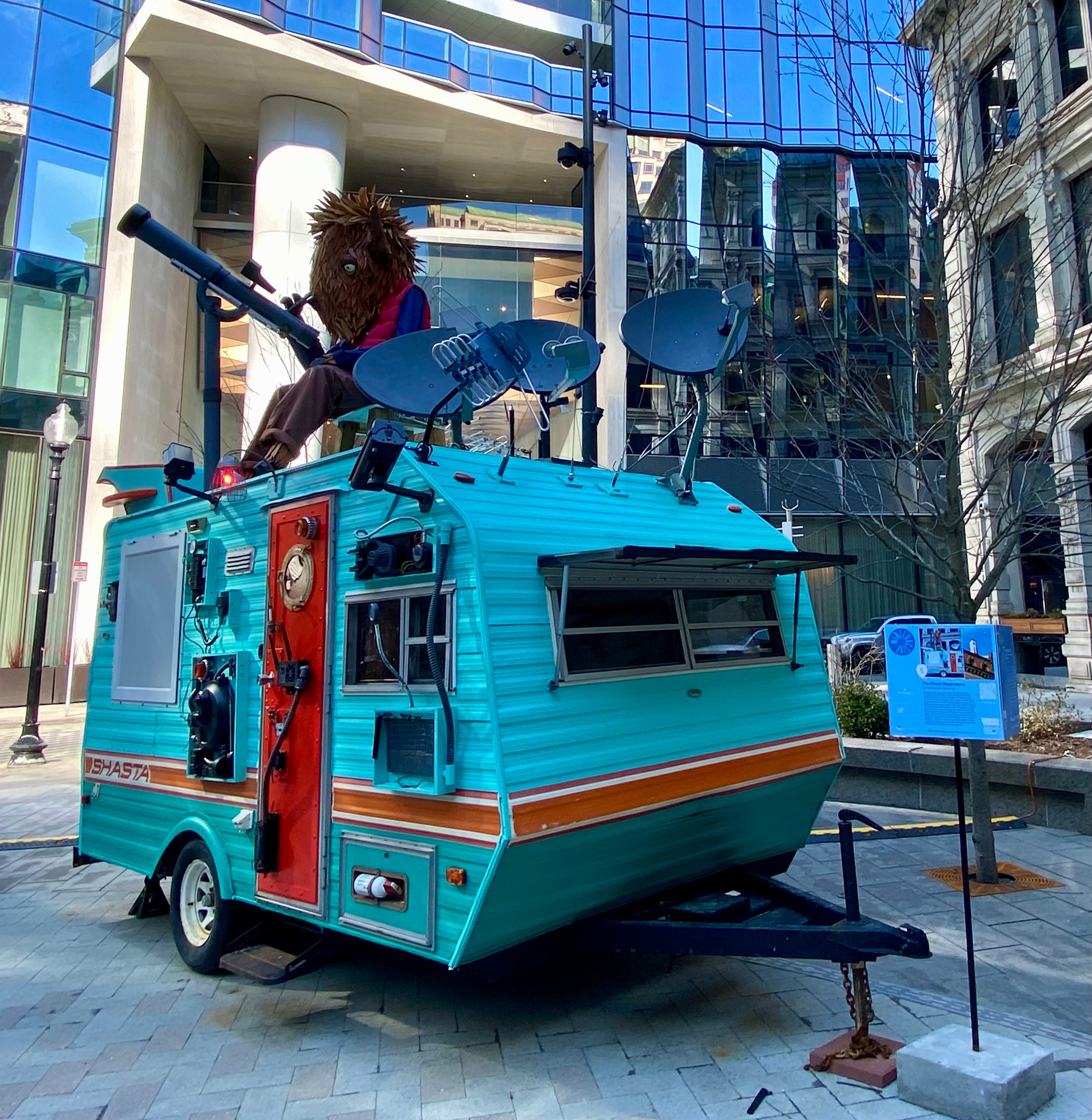 “This installation transforms a retro camping trailer into a playful basecamp and site for discovery in Winthrop Square. From his rooftop perch, a wooden bison explorer peers through a telescope toward a massive rocket installed on a nearby rooftop, tying the square to Boston’s history as the site of America’s first recorded UFO sighting by John Winthrop in 1639.” (quote from The Bison Observatory, Winteractive)
