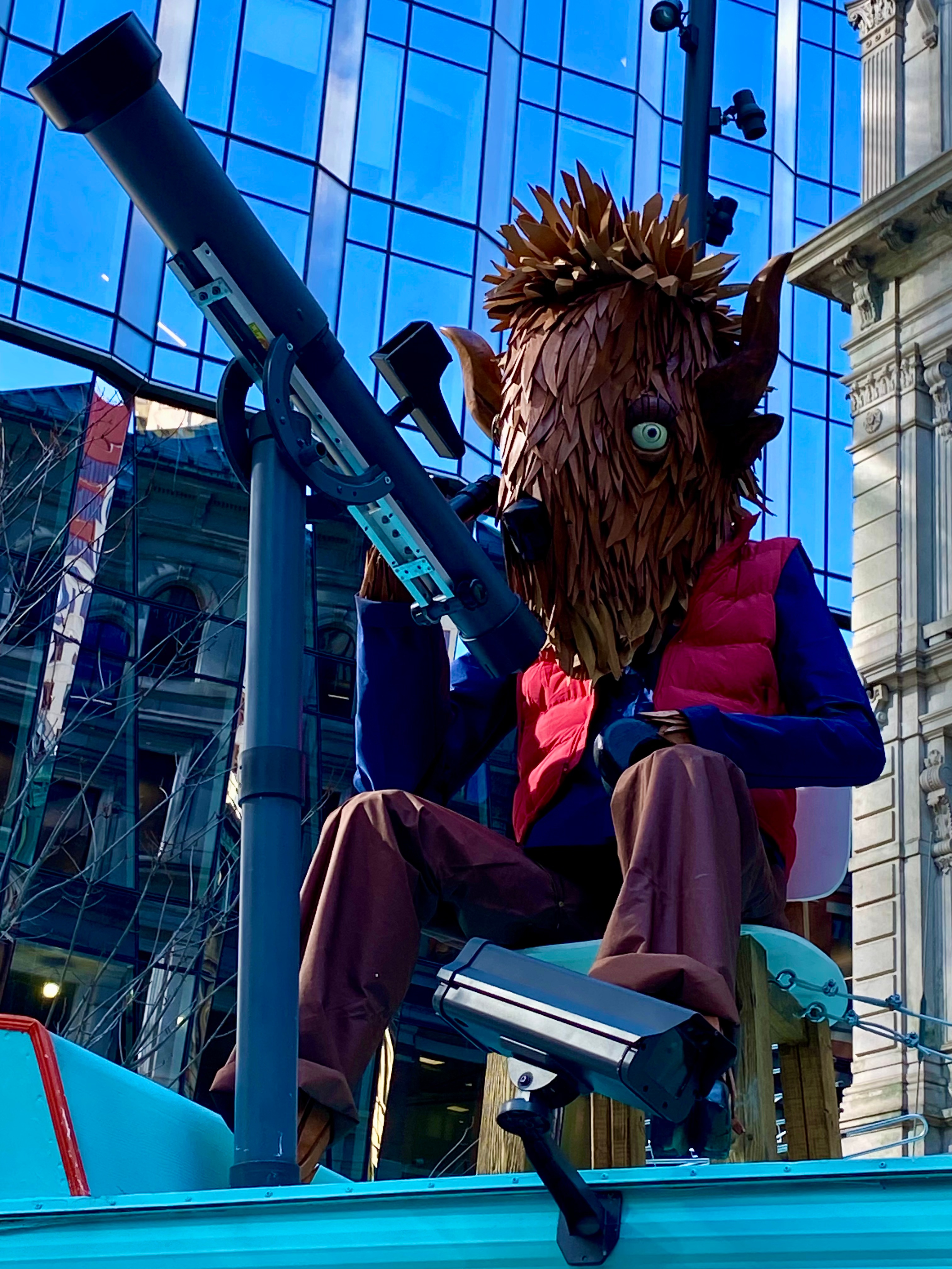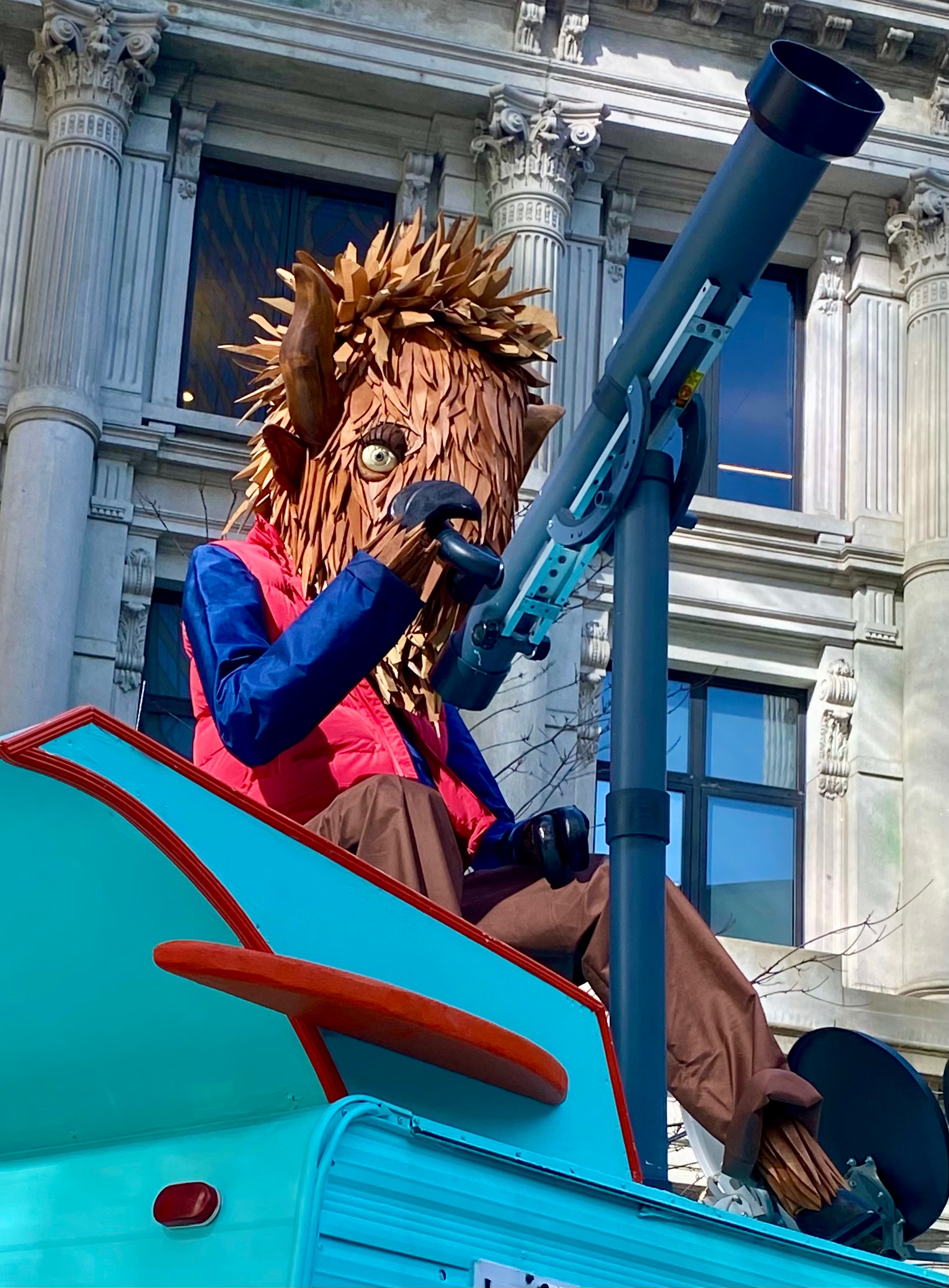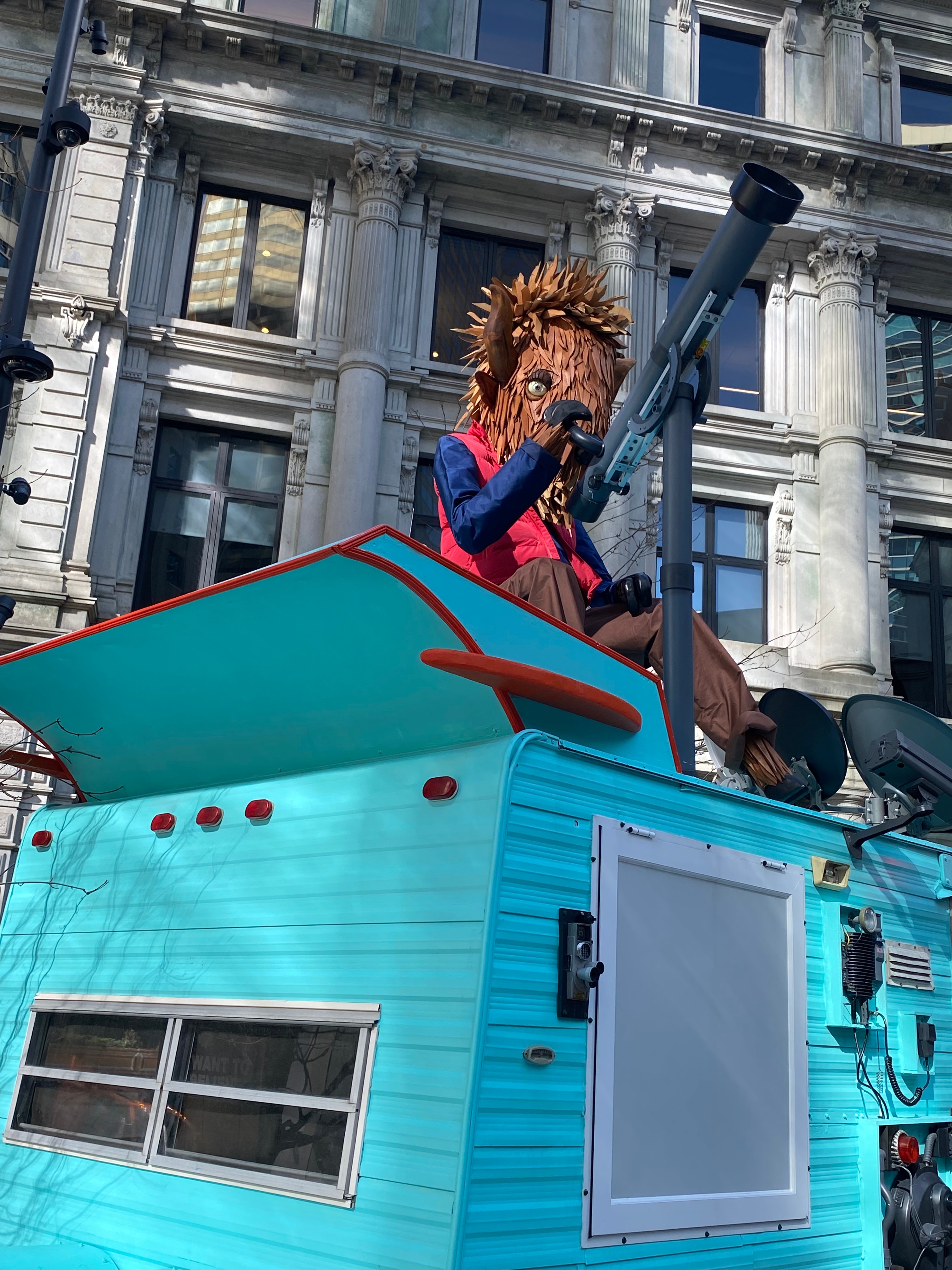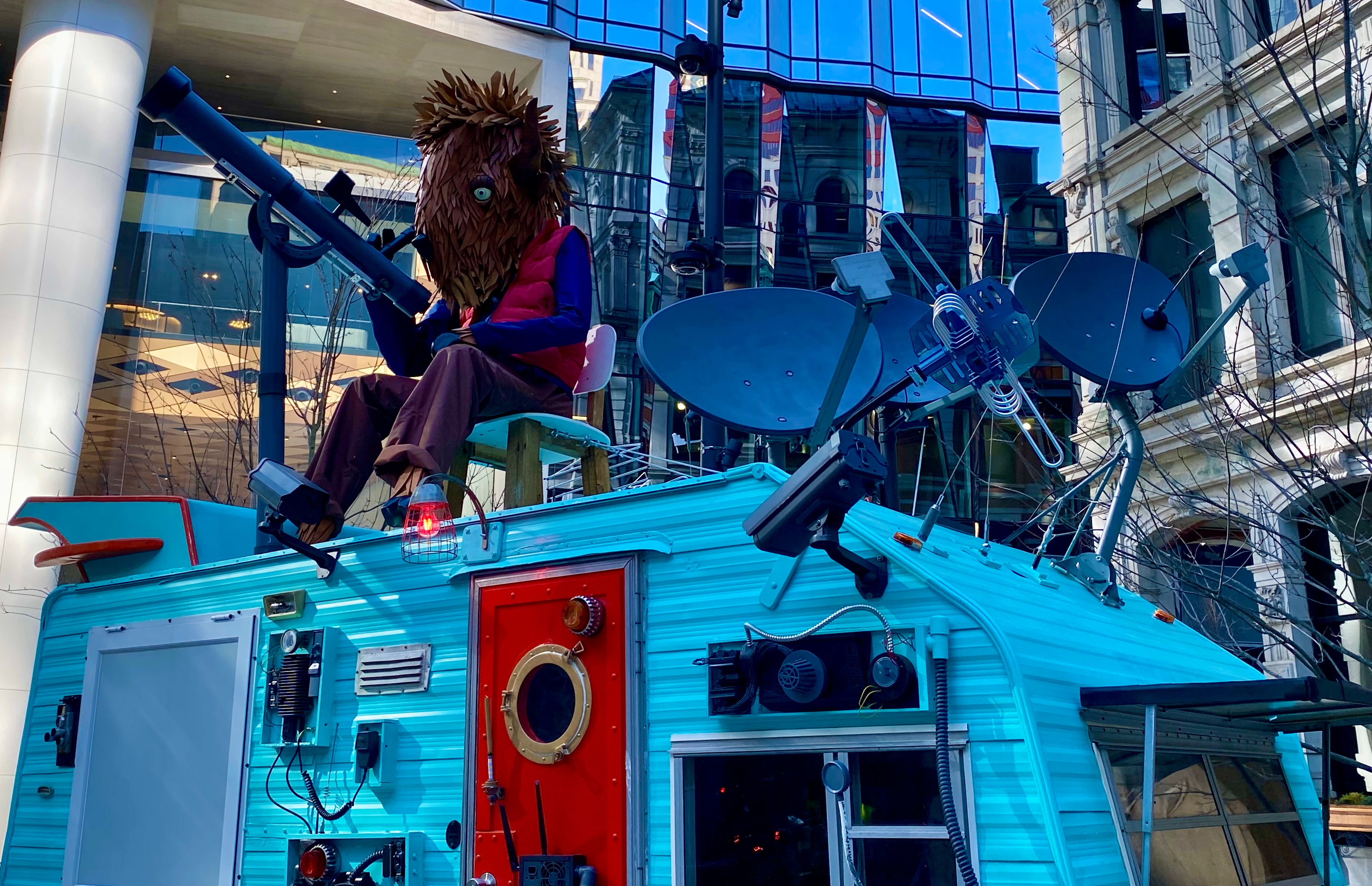 “The Bison Observatory introduces “Bo,” a hand-built wooden bison researcher who has taken up temporary residence in Winthrop Square. Perched beside a retrofitted observatory trailer outfitted with telescopes, antennas, and communication equipment, Bo appears to be carefully monitoring the skies — perhaps in response to a curious rocket that has mysteriously appeared overhead.” ( quote from Individuals Collective website)