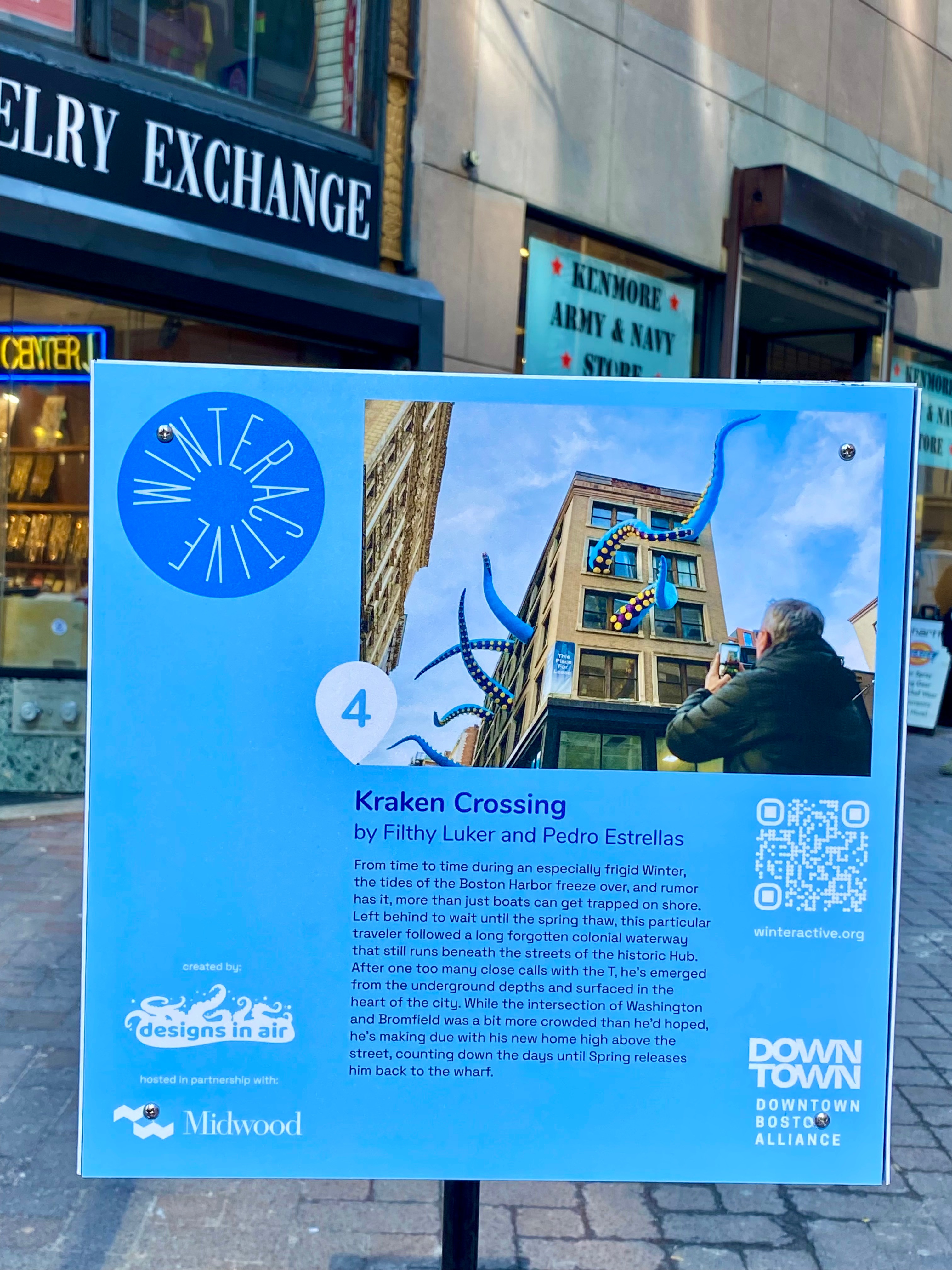 “From time to time during an especially frigid Winter, the tides of the Boston Harbor freeze over, and rumor has it, more than just boats can get trapped on shore. Left behind to wait until the spring thaw, this particular traveler followed a long forgotten colonial waterway that still runs beneath the streets of the historic Hub. After one too many close calls with the T, he’s emerged from the underground depths and surfaced in the heart of the city. ” ( quote from Kraken Cossing, Winteractive ) “