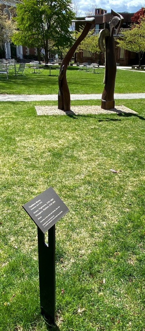 - Two bronze plaques on the sculpture’s base show Eriksson and his crew landing on a rocky shore and, later, sharing the story of their discovery.