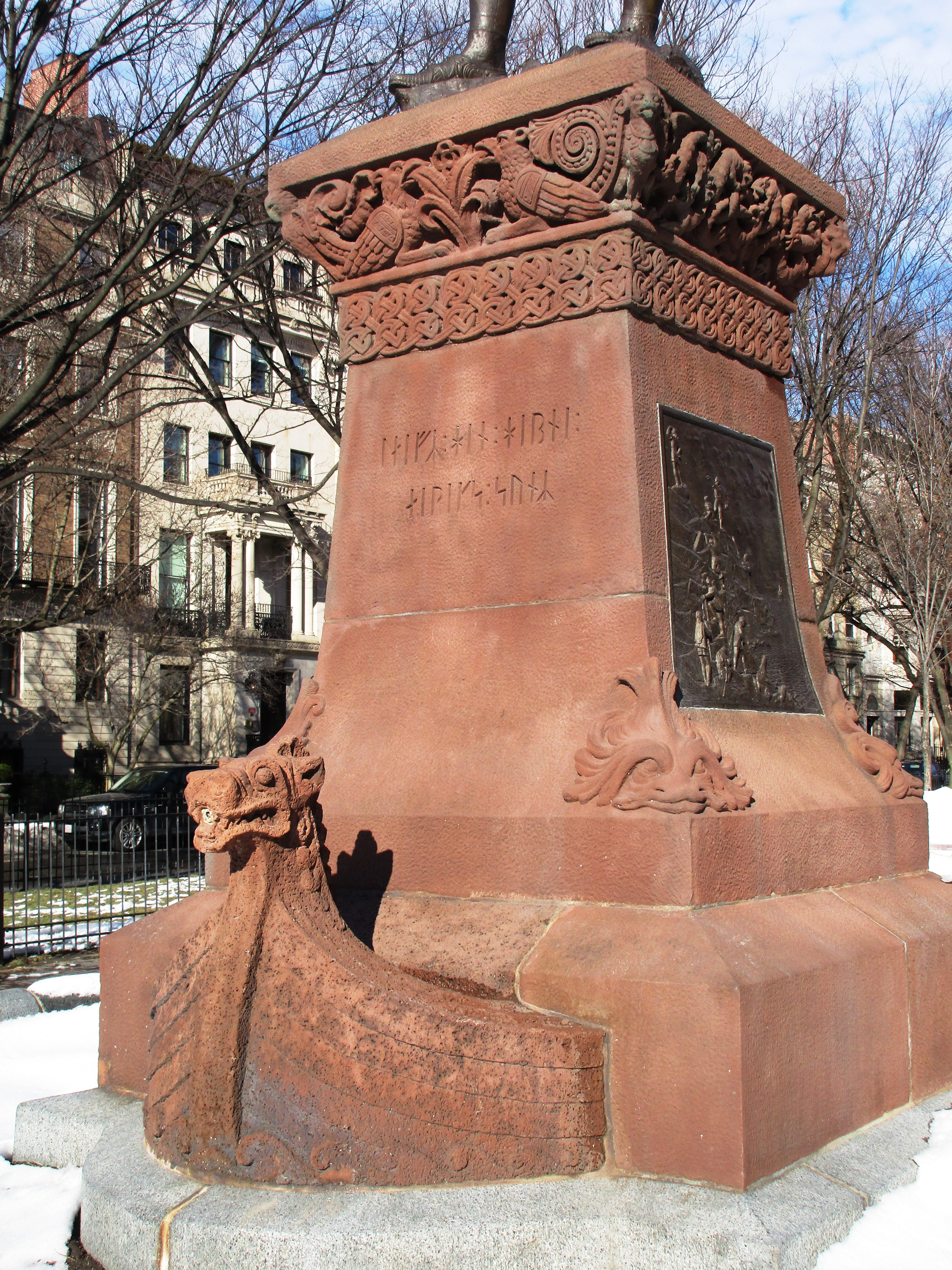 - Two bronze plaques on the sculpture’s base show Eriksson and his crew landing on a rocky shore and, later, sharing the story of their discovery.
