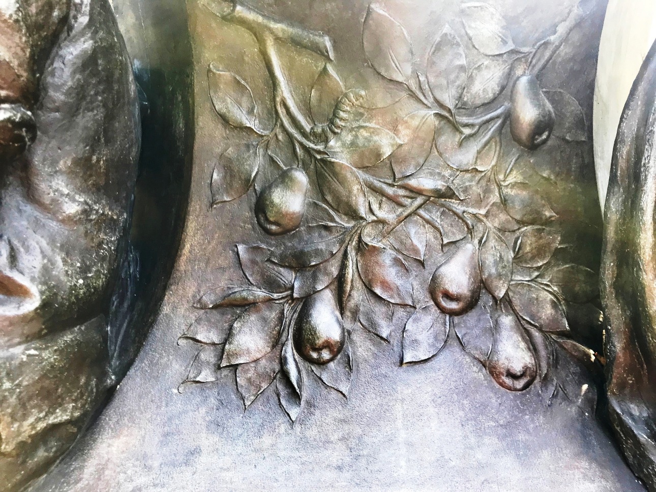 - Two bronze plaques on the sculpture’s base show Eriksson and his crew landing on a rocky shore and, later, sharing the story of their discovery.