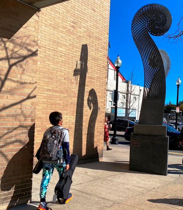 My Saturday afternoon visit to David Phillip’s sculptures along St. Botolph Street was an opportunity to see many young students with string instruments heading to or from lessons and rehearsals. The transported instruments heightened my awareness that each sculpture referenced parts of cellos and violins. This post includes a few photos from that October day plus quotes and links that offer background and pertinent information about the artist’s work. Quotes among the photos all come from one source, which gives perspective on the funding by Tony Lopes for David Phillips’ art: “Sandwich Artist Creates Sculptures For New England Conservatory” by JOANNE BRIANA-GARTNER in Cape News, Sept 2022