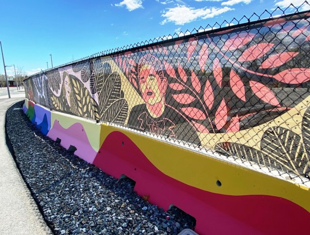 Each of these three artists has created several fabric panels that transform stretches of metal construction fencing near the intersection of Harvard Street and Western Avenue in Allston. One, Anna Dugan, incorporated concrete Jersey barriers as well. All three worked out their own distinctive series of panels printed on scrim, a lightweight durable translucent textile that has long been used in theater sets. Daylight, street light, clouds, the sky itself, and any machinery or equipment behind the fence can add variables to our view. Whether driving by or standing near, we respond to these shifting features. I grew more aware of such changes as I photographed the art. In fact, I felt that each artist had recognized and successfully addressed the possibilities of scrim.