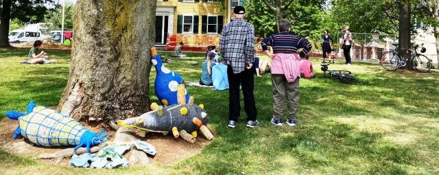 In early June I saw the following notice in Arts Arlington: “OWN A PIECE OF PUBLIC ART HISTORY! ‘Persistence’ Exhibit & Sale at Arlington Porchfest Join us during Porchfest (June 18, 1 to 4 pm) to get a close look at Michelle Lougee’s whimsical creations for the Minuteman Bikeway during an exhibition and sale of the sculptural pieces that make up PERSISTENCE. “( quote from Arts Arlington newsletter June 2022) The notice inspired my photo spree 1) along the bikeway while the sculptures were still up, 2) in the outdoor exhibit where they were finally touchable, 3) among the bikeway trees persisting after their departure. This post is my journal from each of the three phases, with photos, notes, quotes, and promising links.