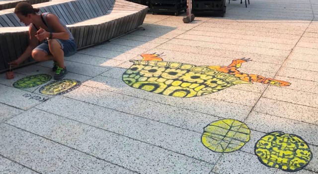 The person I saw painting attractive images on Science Center Plaza said she was not an artist, but she was creating interactive art to engage people with rich resources from the Harvard Museums of Science and Culture while the physical doors are still closed to visitors. She noted that the paintings on the plaza would be power-washed away in a few weeks. So once again I’ll post quickly to speed the news about temporary art before it goes.