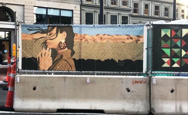 View two of a few recent additions to visual art in Harvard Square. I’ll save the rest for future posts. Both artworks involve creative use of fabric. Both are in settings that don’t always enhance viewing or documenting art. But as Patricia Thaxton notes on her printed mural “The Beauty of Everyday Living,” it is about joy and harmony “in spite of it all,…”, including unavoidable traffic, trash, and construction equipment. See photos, quotes, and links: