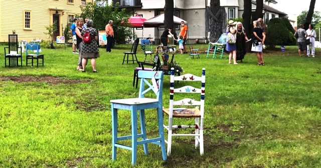 Sculpture by Leslie Wilcox, Poetry by Jessie Brown, Chairs Transformed by Many Artists: This post honors an inspiring event last Saturday (8/21/21) that reminded me, yet again, of how much public art keeps offering no matter how many challenges continue. Walking among at least thirty chairs and six tall trees with unique creative identities, I began to understand they all shared histories extended by artists’ careful appreciative attention. Also most chairs there were made with wood, so crafted originally from trees. Musical performances, poetry reading, artist talk, and many other happenings were free for anyone who visited the lawn of the historic Jason Russell House near Arlington Center.