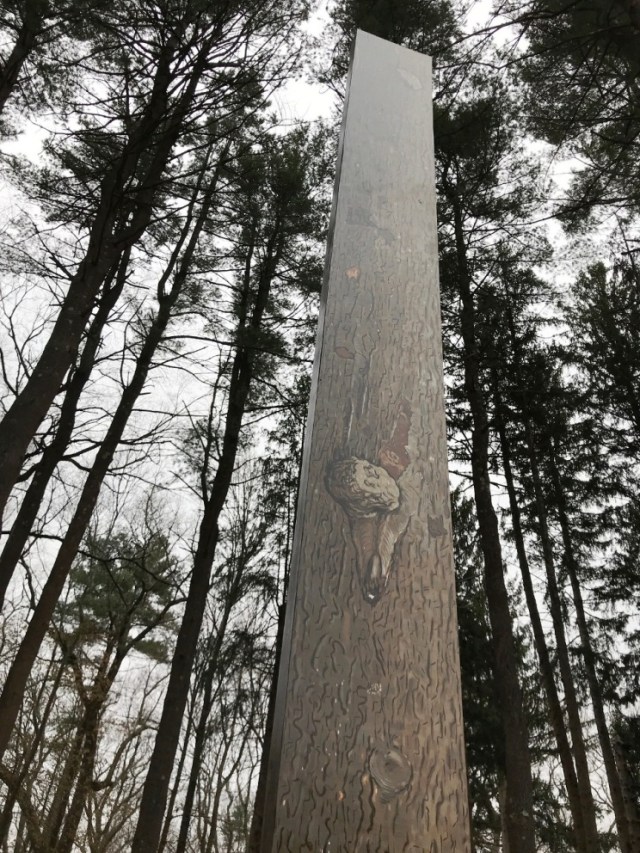 Sonfist’s The Endangered Species of New England has been part of the Sculpture Park since 2013. Rosenblum’s Venusvine, created 1990, has been there since 1996. Both artworks reflect their artists’ deeply rooted work with trees. Both are metal renderings of natural forms. Both artworks have decisive locations in the park. They’ve held their ground while other artworks have moved around, left or entered in recent years.