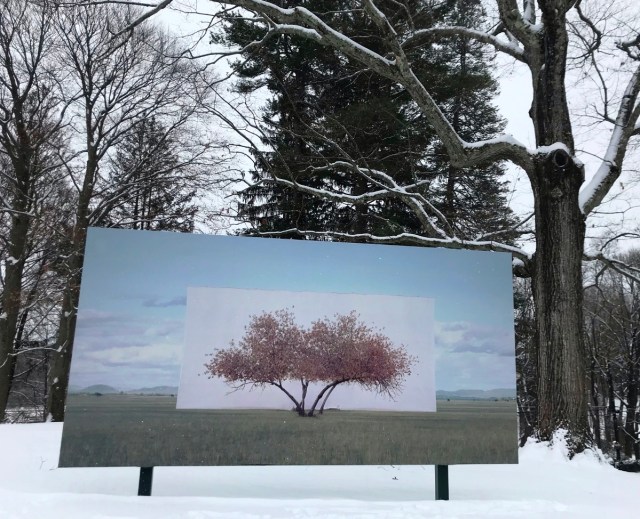 Artists Myoung Ho Lee and B. Wurtz both focus carefully on single trees in these two samples from larger projects that reflect their own unique creative processes. Their artworks thrive on the trees and sky through seasonal or daily changes of their current settings in deCordova Sculpture Park. My iPhone photos here hint at those, while quotes give basic background. Links (in red) to intriguing resources reveal fascinating features of both artists’ approaches and results.