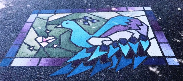 Four distinctive paintings appeared on the bike path in Somerville and Cambridge this summer. None are signed but all contain the same heart emblem and related design elements. I post now to share these elegant images and to ask for help in identifying the artist(s), process and maybe more places to admire such alluring art.