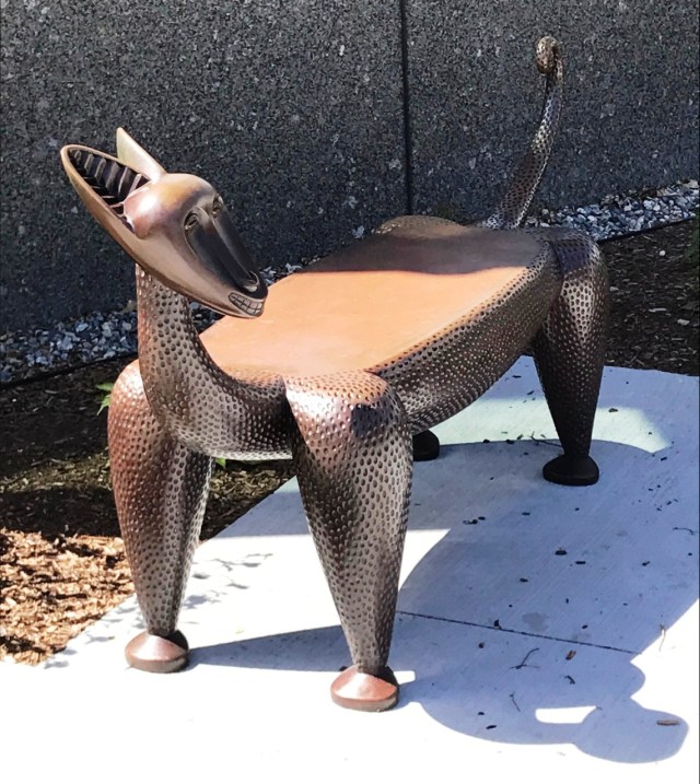 Judy McKie’s bronze cat benches and Jay Coogan’s aluminum dogs and cats were kept off location during extensive construction of Cambridge Public school and library properties where they had become favorite features. Soon after they returned ready to resume their roles, the closing of all schools and libraries in March 2020 cut short the opportunities for children and adults to interact with them again. Though I had found opportunities to admire and photograph these artful animals, I didn’t want to share the images until the sculptures could be part of daily life once more.