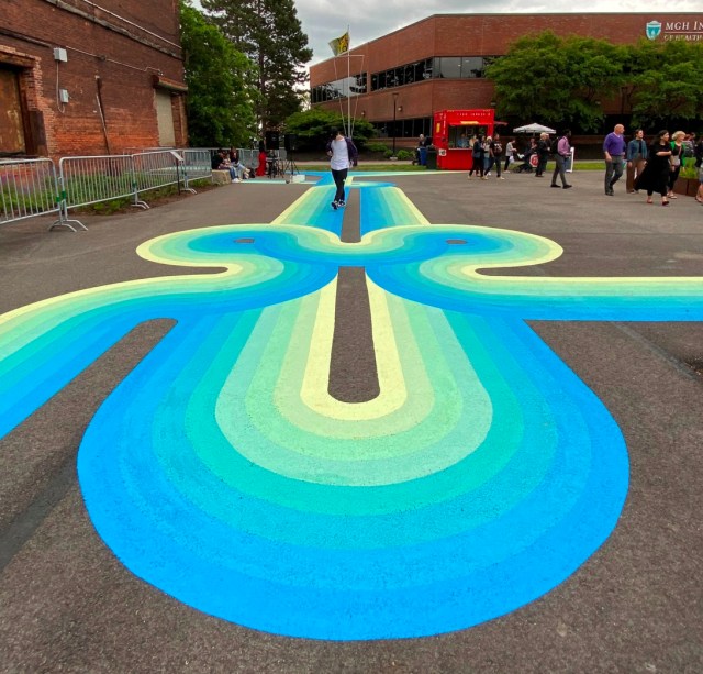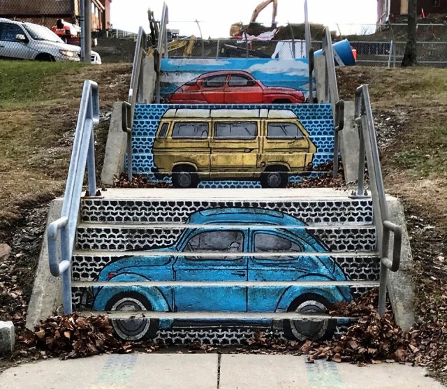 Here are my photos from 2018 of Liz Lamanche’s unique, memorable mural I had long hoped to post about. Delayed with hopes of getting more worthy photos in different seasons, I was then daunted by roped-off, covered steps during a few years of construction related to the Boston area transportation system.