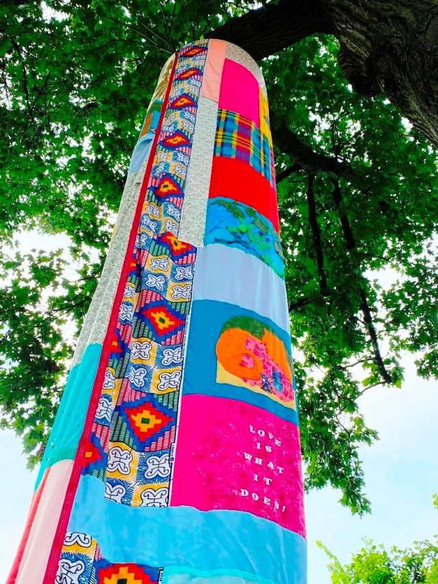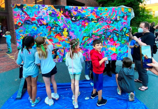 Among the many engaging activities for all ages at the Harvard Museums’ Summer Solstice Festival 2023 was one that invited everyone to add brilliant colors to murals designed for the occasion by artist Howie Green. My arrival and photo-taking began after the artwork had already developed through several hours of turn-taking by attentive participants with brushes and chosen paint colors.